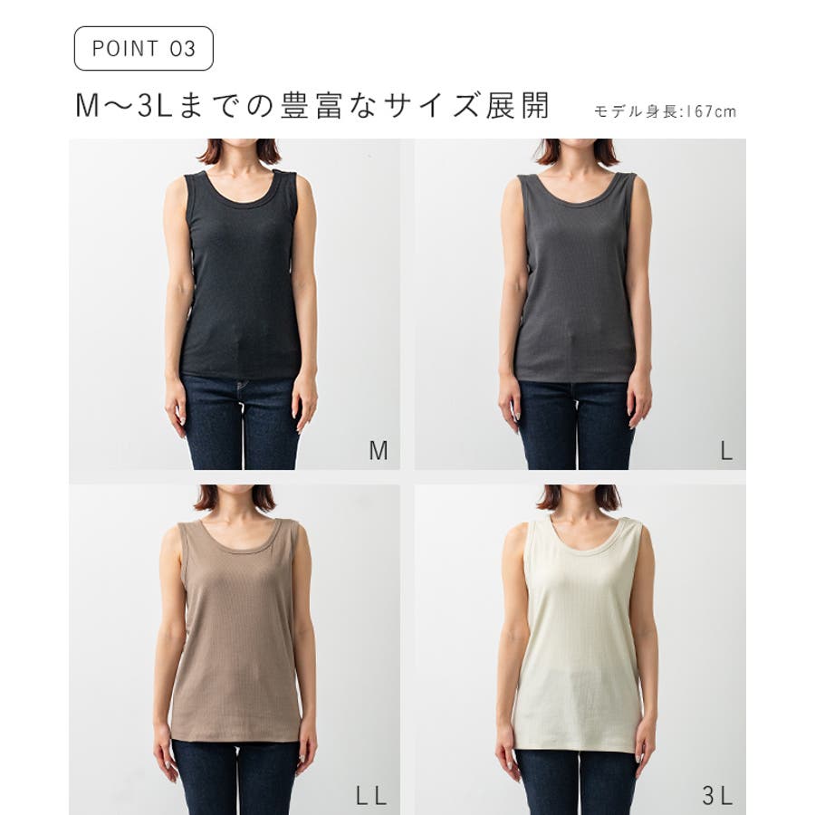 インナー用にぴったりサイズ、重ね着用に少し大きいサイズなど体型や好み、着心地に合わせて選べる4サイズ展開。