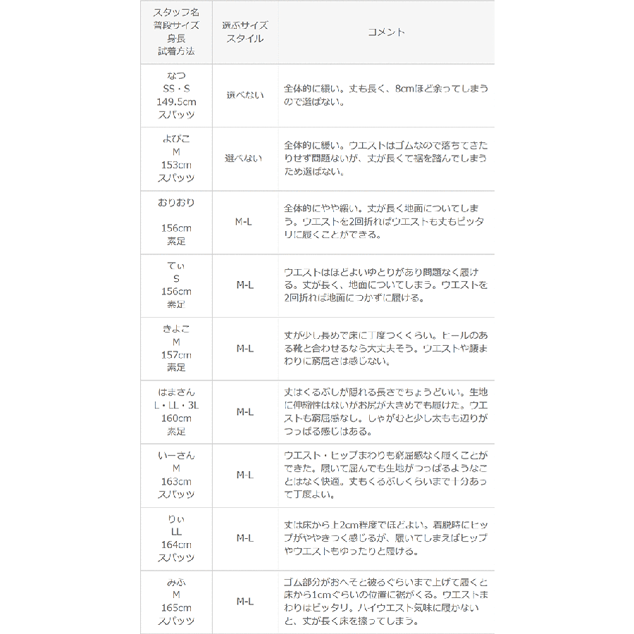 | 選ぶサイズ M~L | ウエストはほどよいゆとりがあり問題なく履ける。丈が長く、地面についてしまう。ウエストを2回折れば地面につかずに履ける。 |