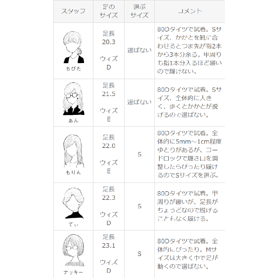 選ぶサイズ S | 80Dタイツで試着。甲周りが緩いが、足長がちょうどなので脱げることもなく履ける。 |