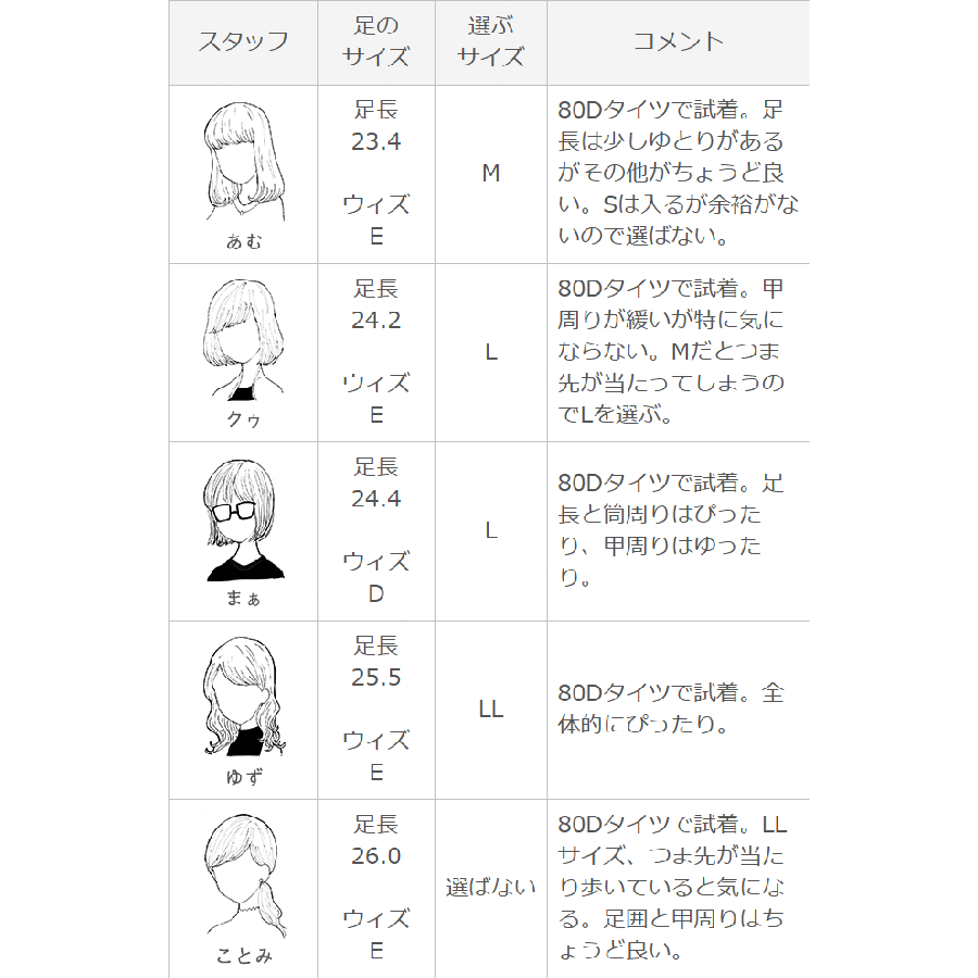 選ぶサイズ S | 80Dタイツで試着。全体的にぴったり。Mサイズは大きく中で足が動くので選ばない。 |