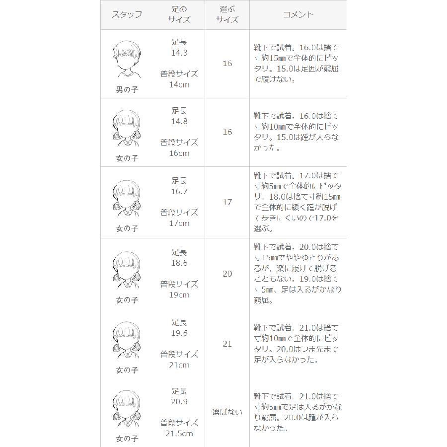 靴下で試着。17.0は捨て寸約5mmで全体的にピッタリ。18.0は捨て寸約15mmで全体的に緩く踵が脱げて歩きにくいので17.0を選ぶ。