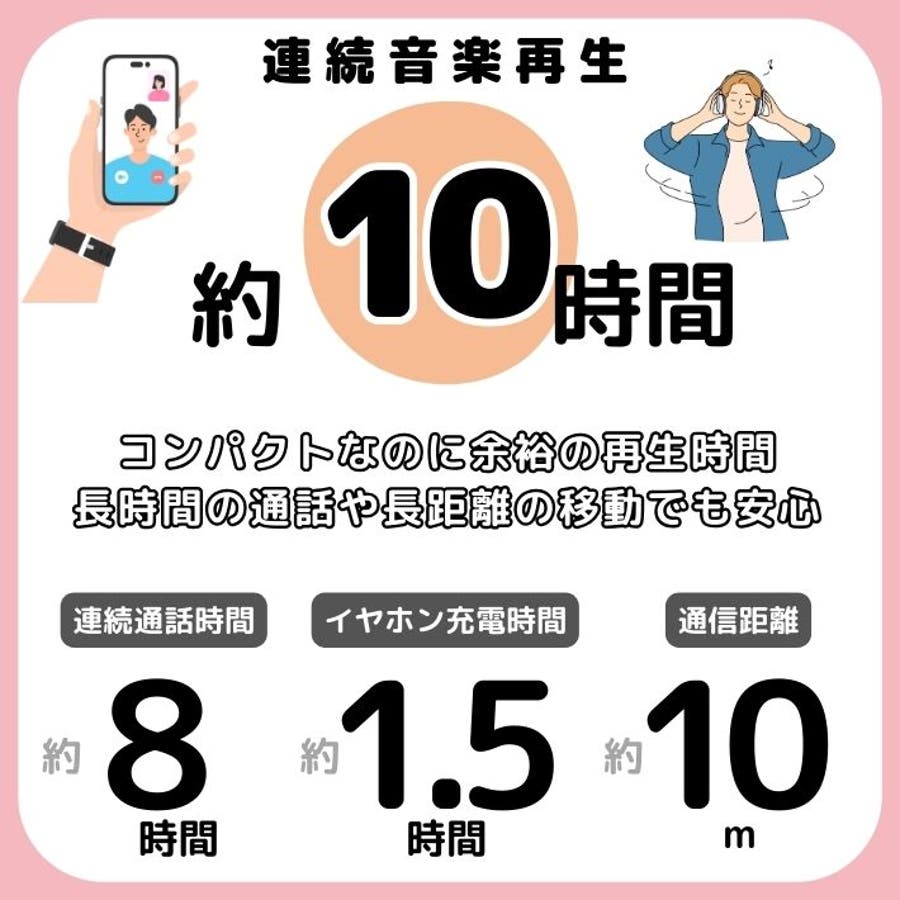 長時間の通話にも対応し、内蔵マイクによりハンズフリー通話が可能です。軽量で実用的なデザインは、日常生活をさらに便利にします。iPhoneやAndroidデバイスとの互換性を備えいます。