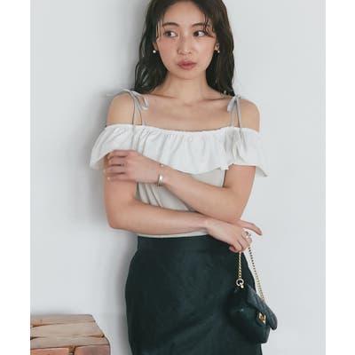 配色、異素材のフリルは目を引くデザインポイントで肩ひもの細いリボンが華奢見え効果も。
