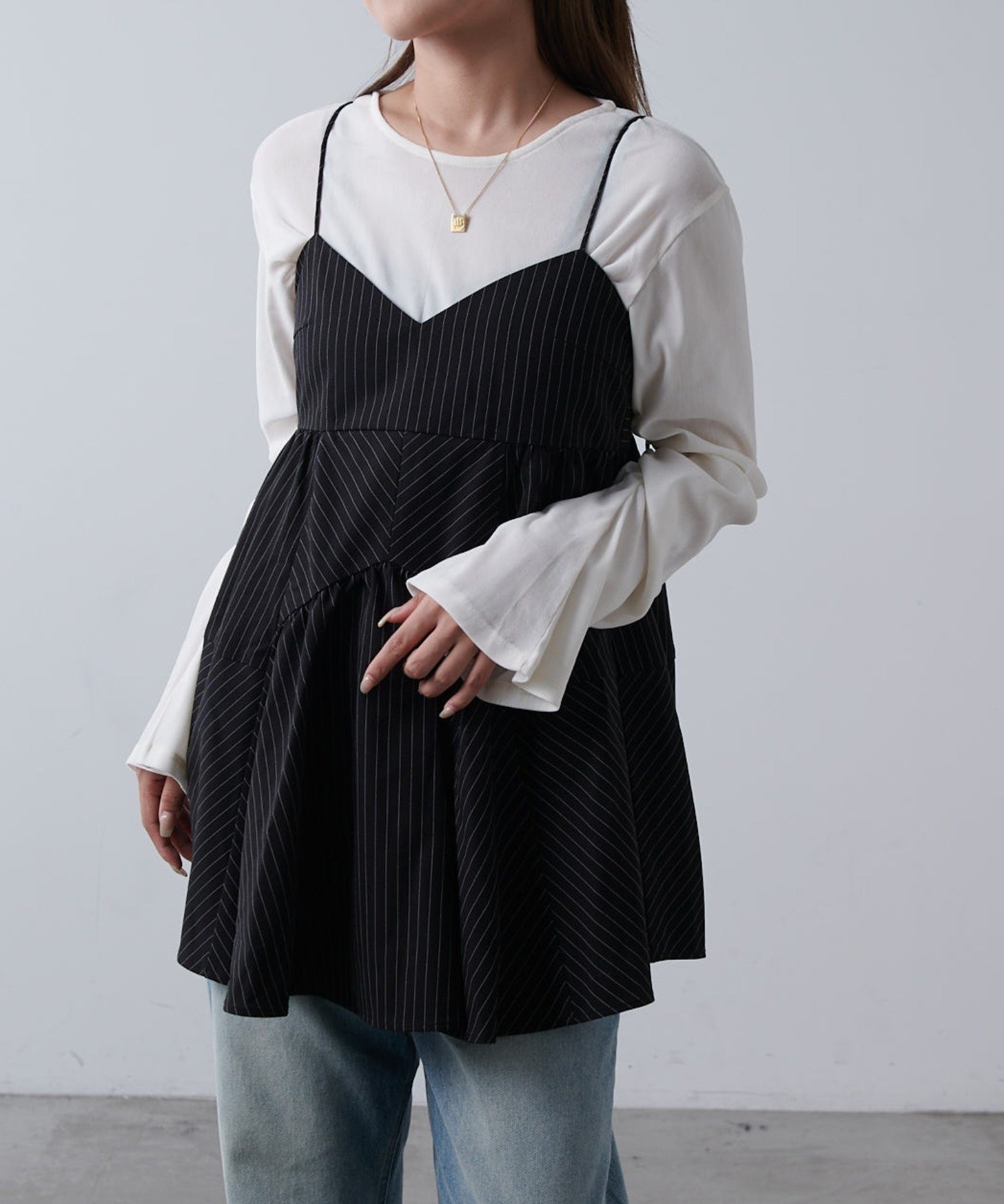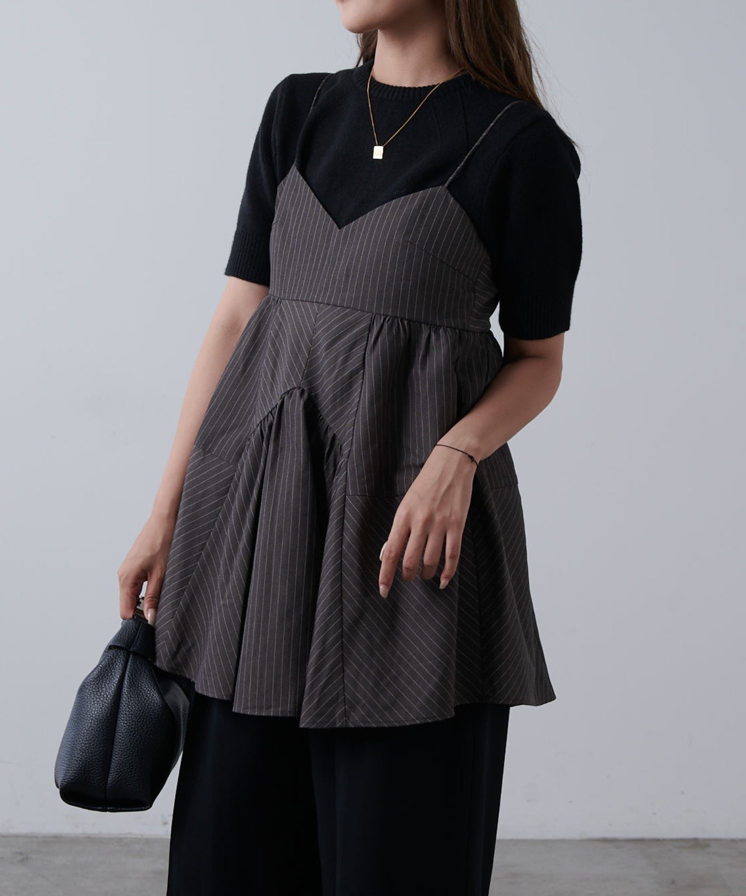 一癖あるデザインのキャミビスチェで、シャツやTシャツにレイヤードするのはもちろん、薄手のニットに重ねることでスタイルアップに。