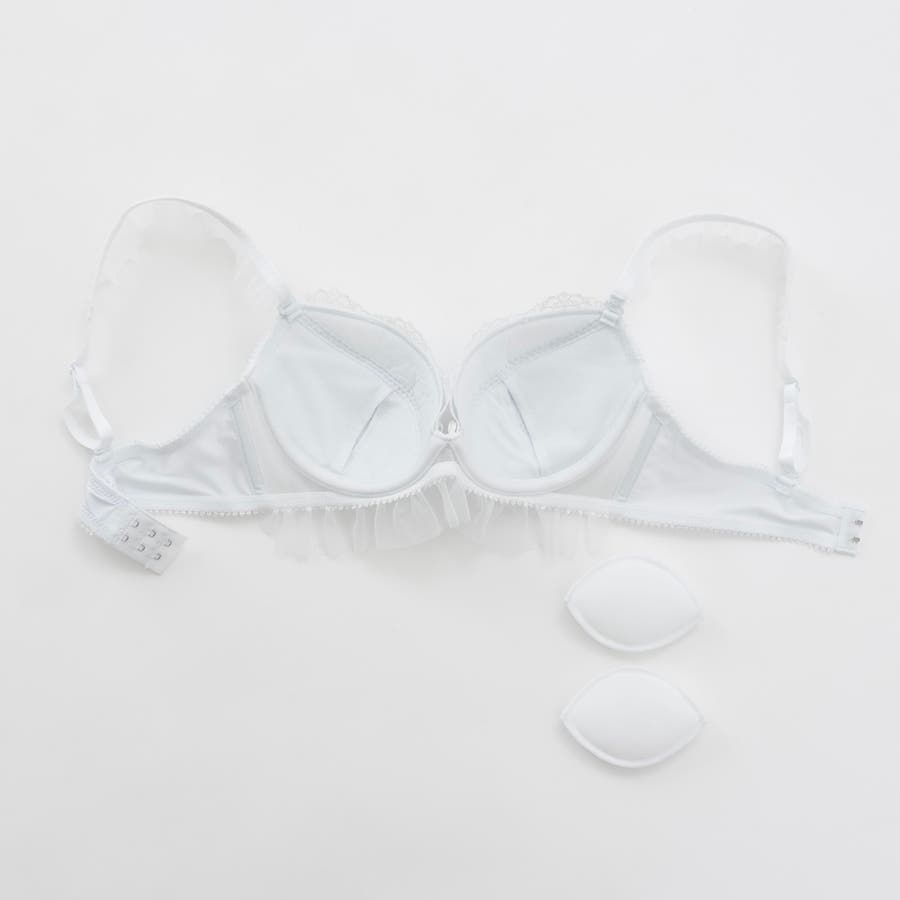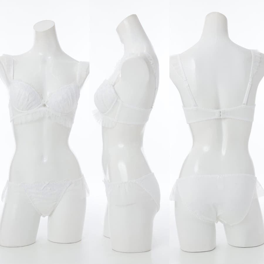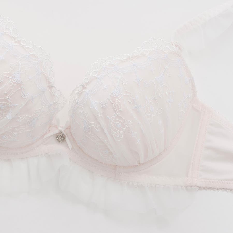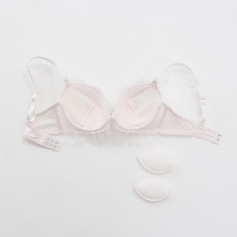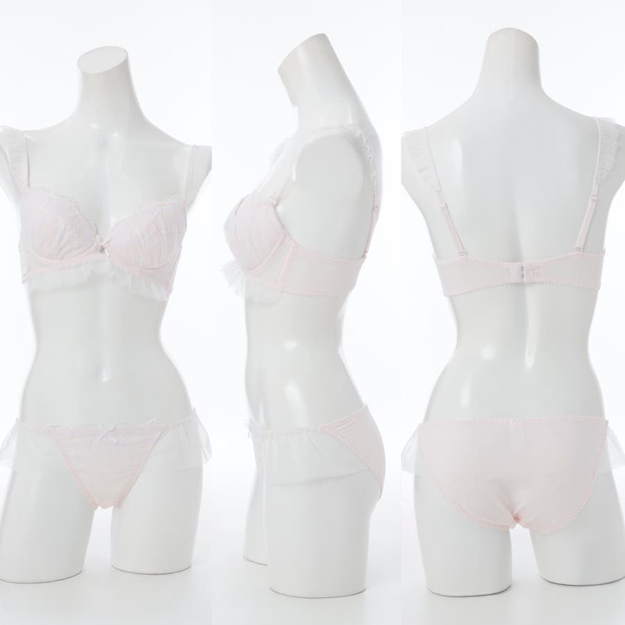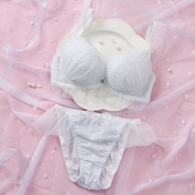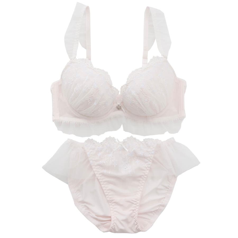 ブラのストラップとアンダー、ショーツのサイドにあしらったふんわり揺れるフリルチュールが甘く可憐なシルエットを演出するブラとショーツの下着セットです。