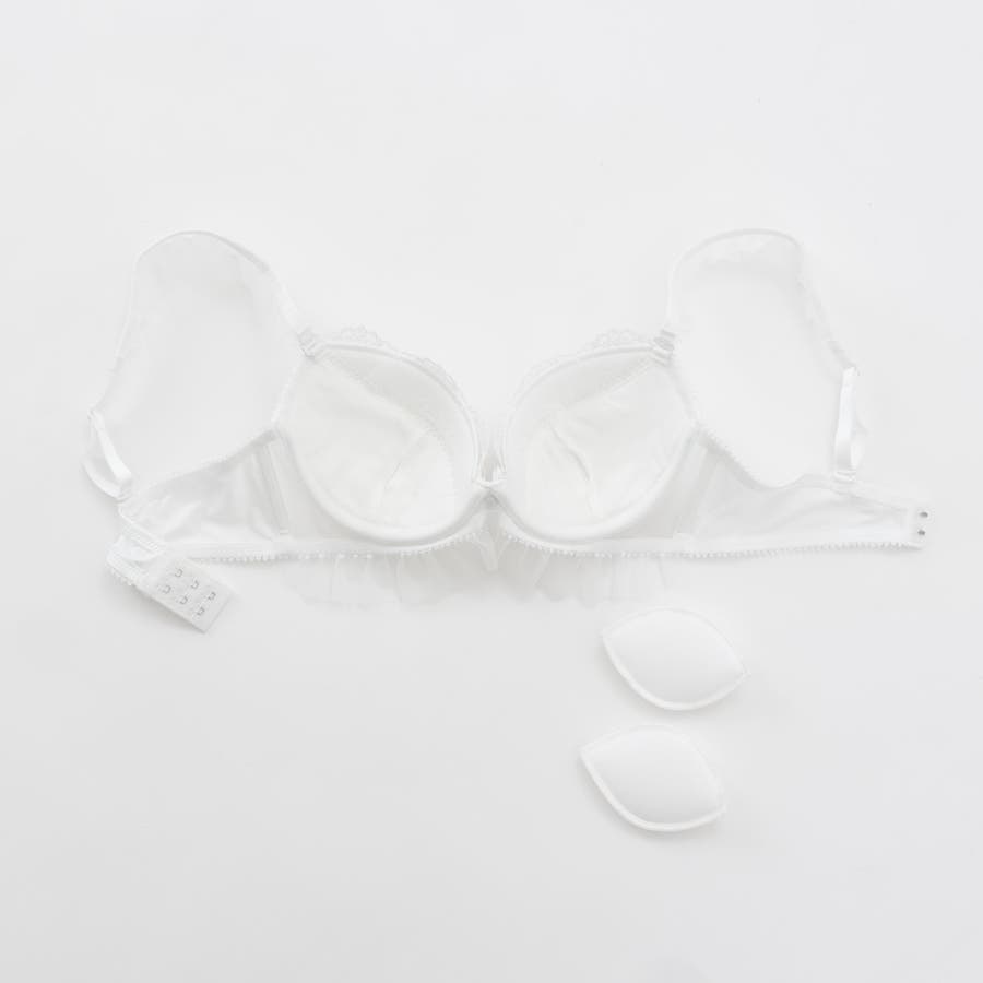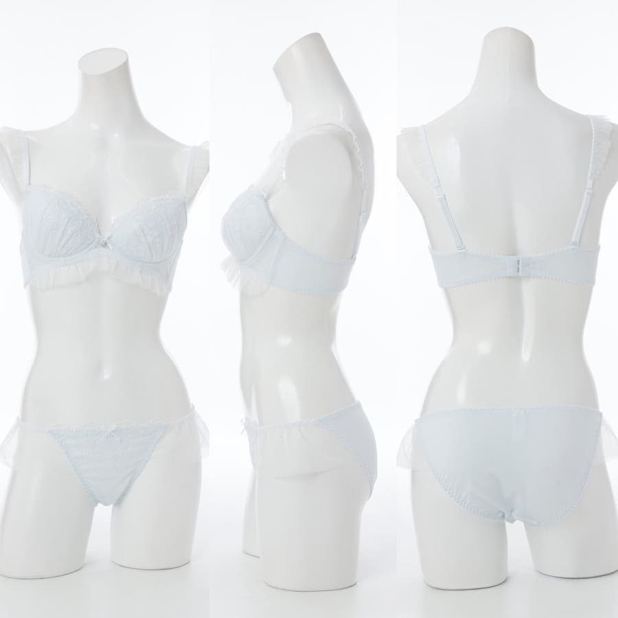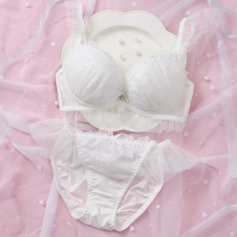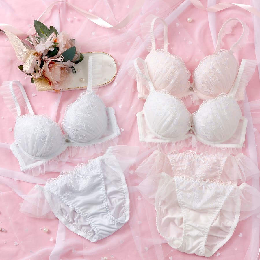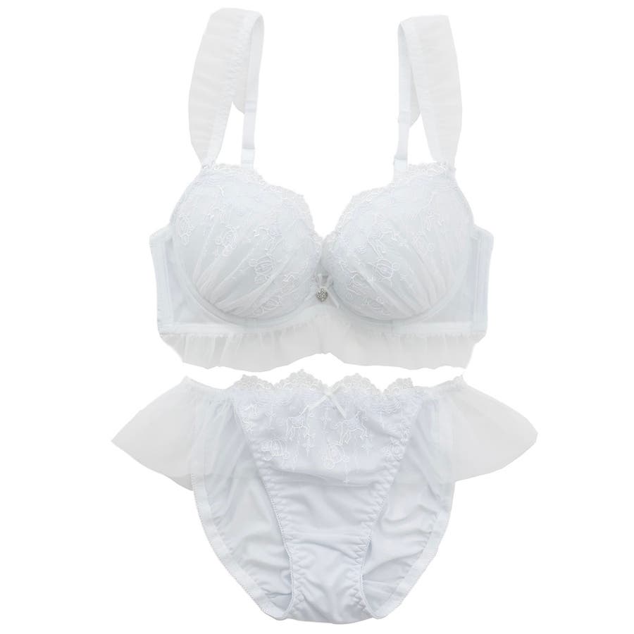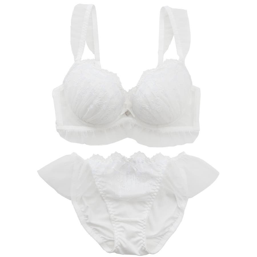 ブラのストラップとアンダー、ショーツのサイドにあしらったふんわり揺れるフリルチュールが甘く可憐なシルエットを演出するブラとショーツの下着セットです。