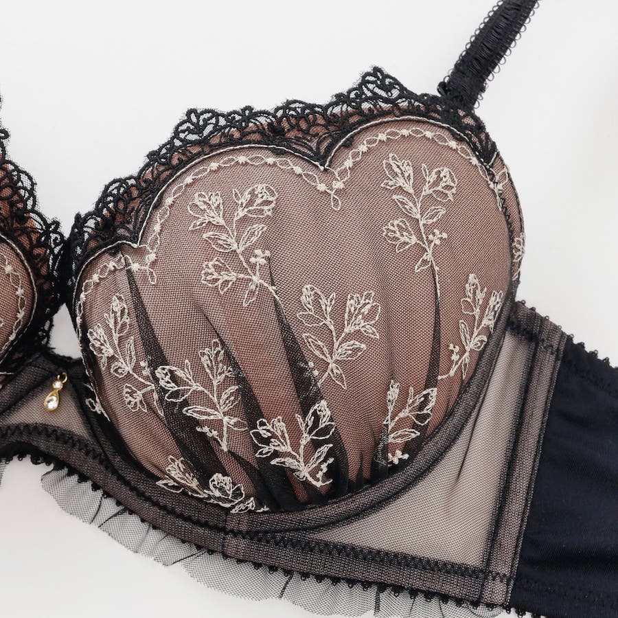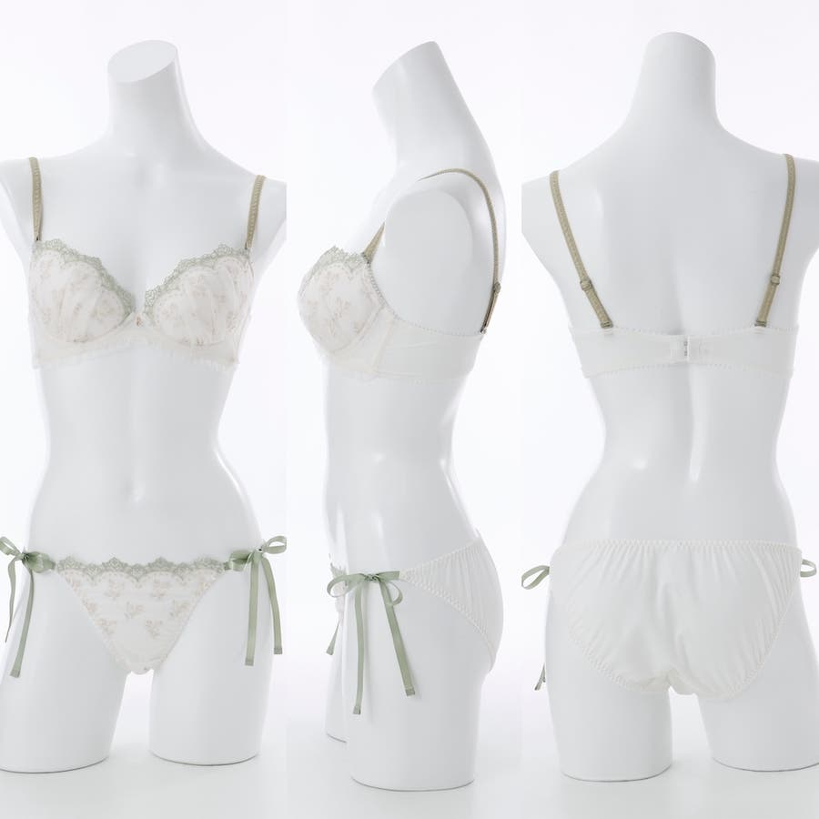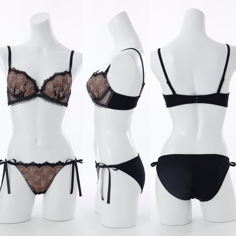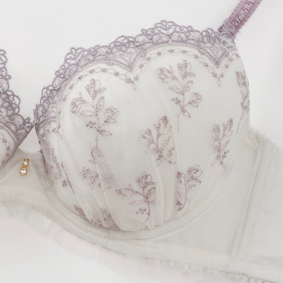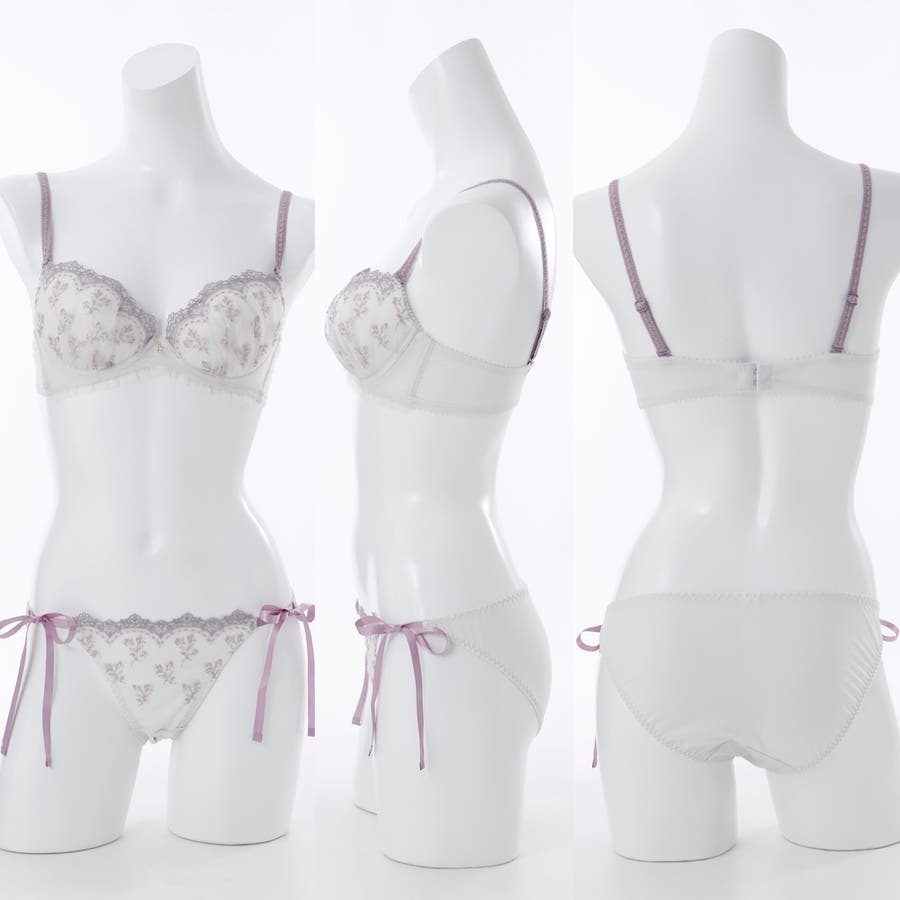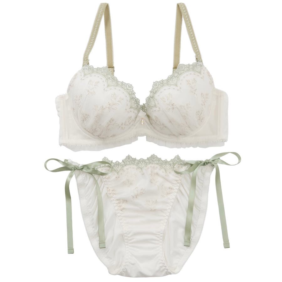 繊細な花束の刺繍と、カップ上辺にほどこしたスカラ刺繍がポイントのガーリーな雰囲気のブラとショーツの下着セットです。