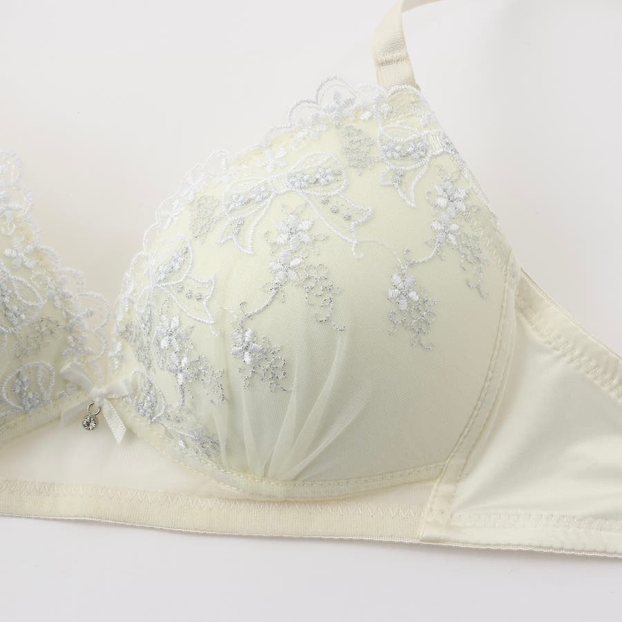 大好評”ノンワイヤーシリーズ”ラメ糸を施したリボンの刺繍がとってもガーリーなノンワイヤーブラとショーツの下着セットです。