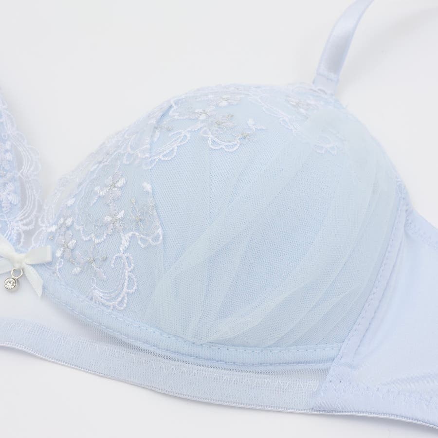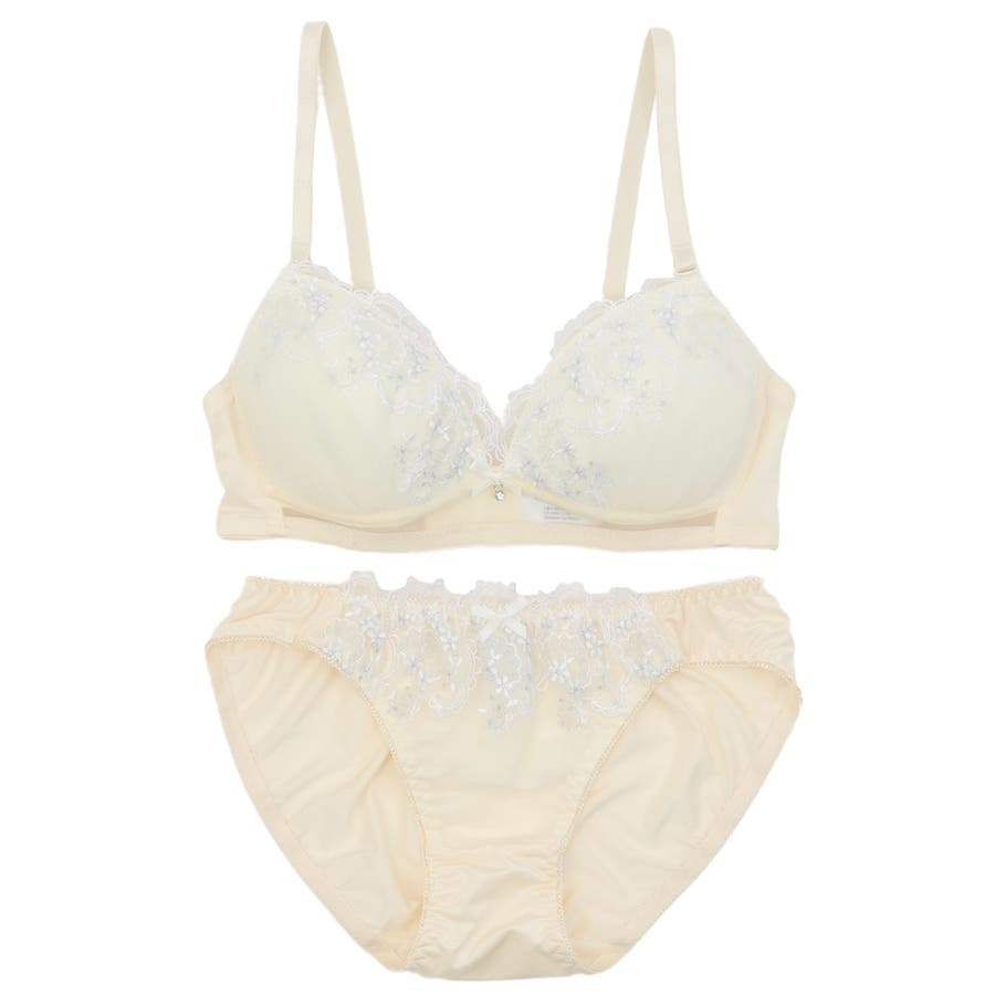 大好評”ノンワイヤーシリーズ”ラメ糸を施した小花の刺繍とチュールレースをあわせたふんわり可愛いガーリーなノンワイヤーブラとショーツの下着セットです。