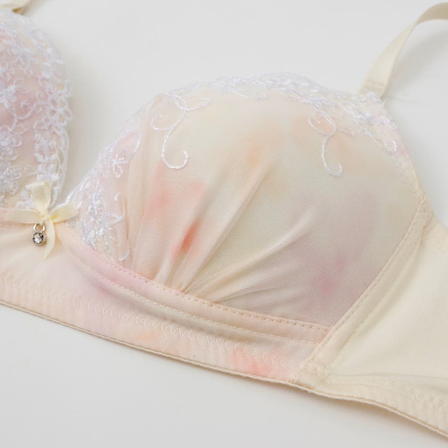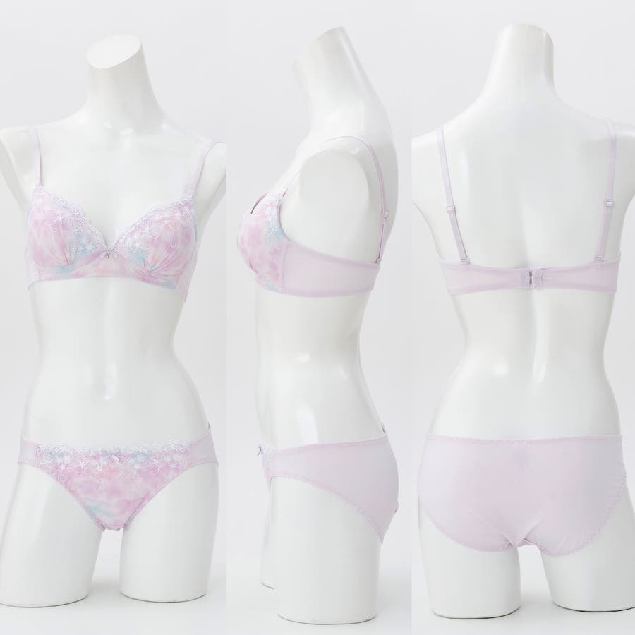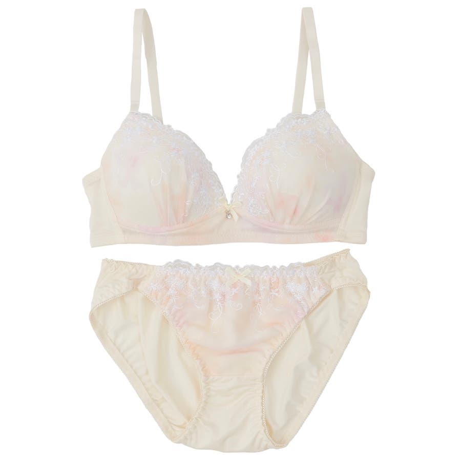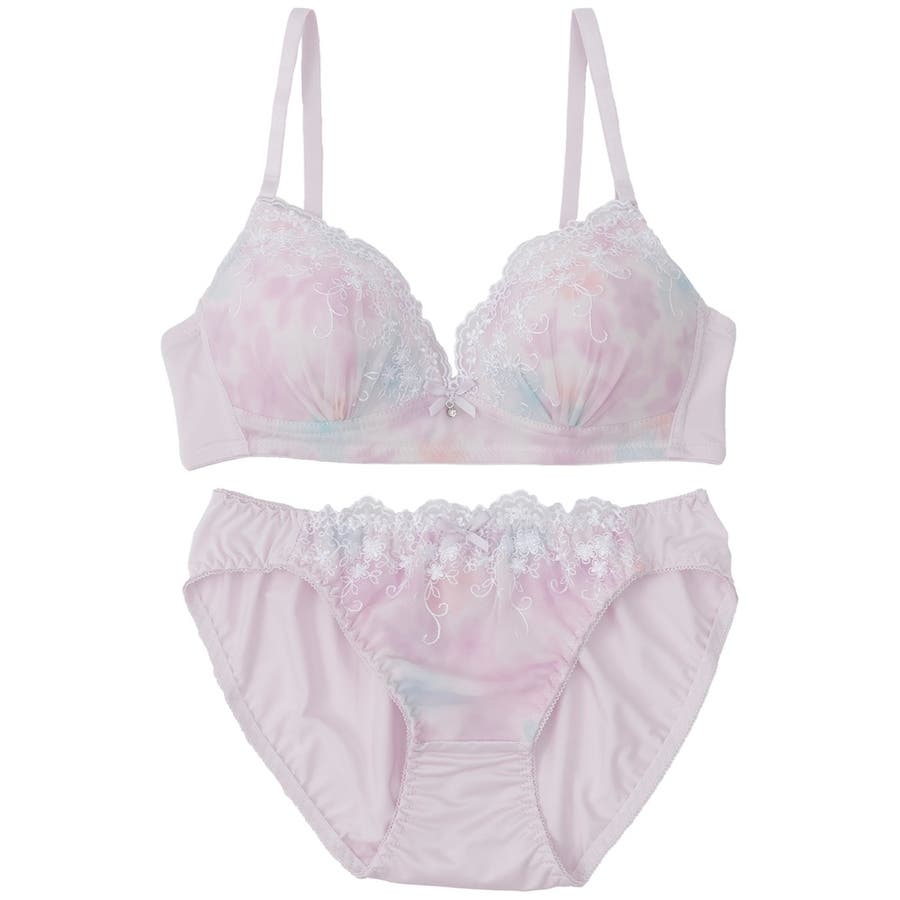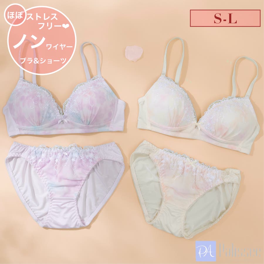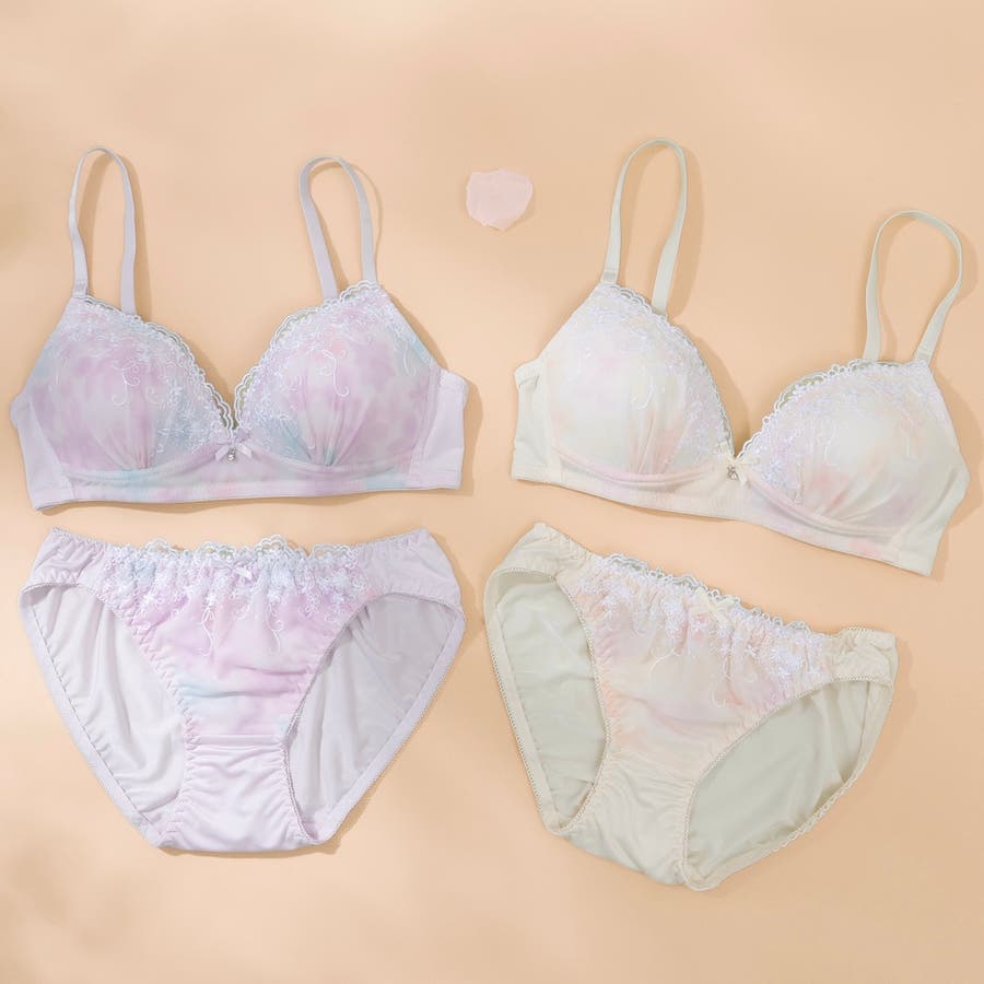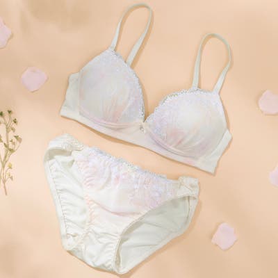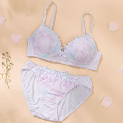 大好評”ノンワイヤーシリーズ”水彩プリントに小花刺繍のレースをかぶせたふんわり可愛いガーリーなノンワイヤーブラとショーツの下着セットです。