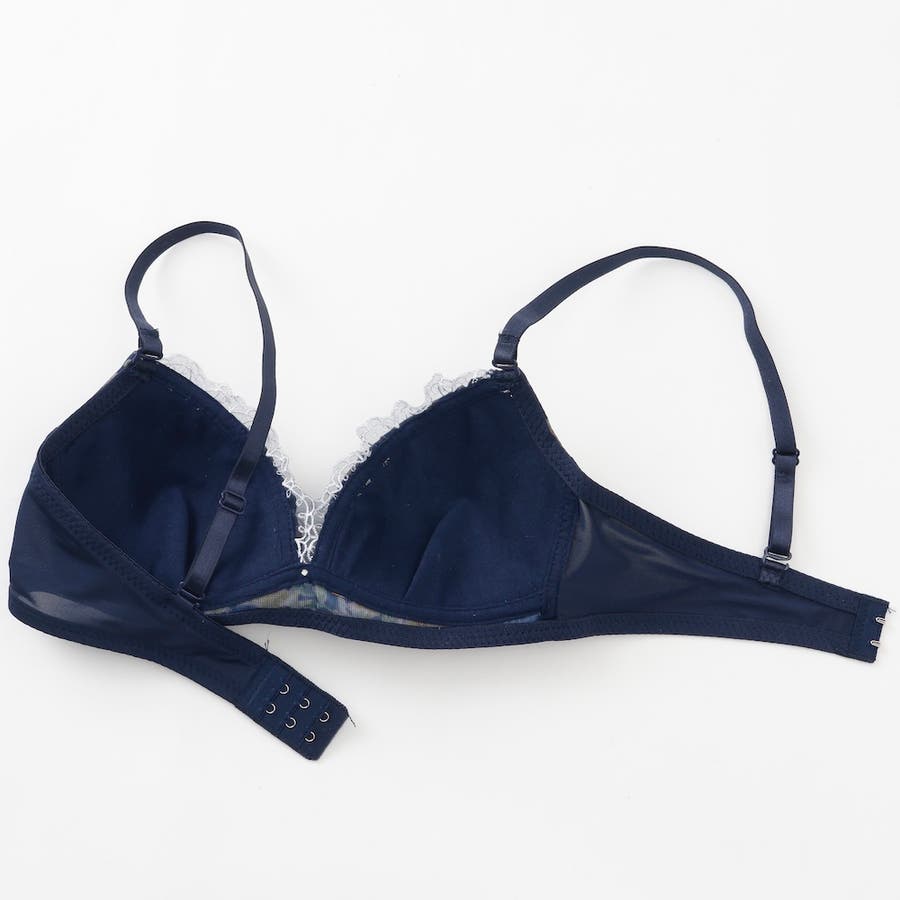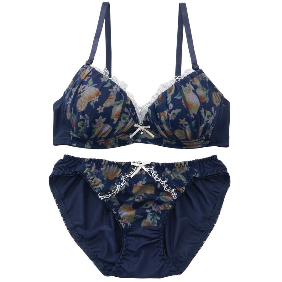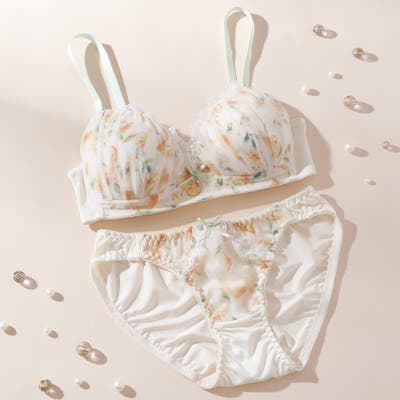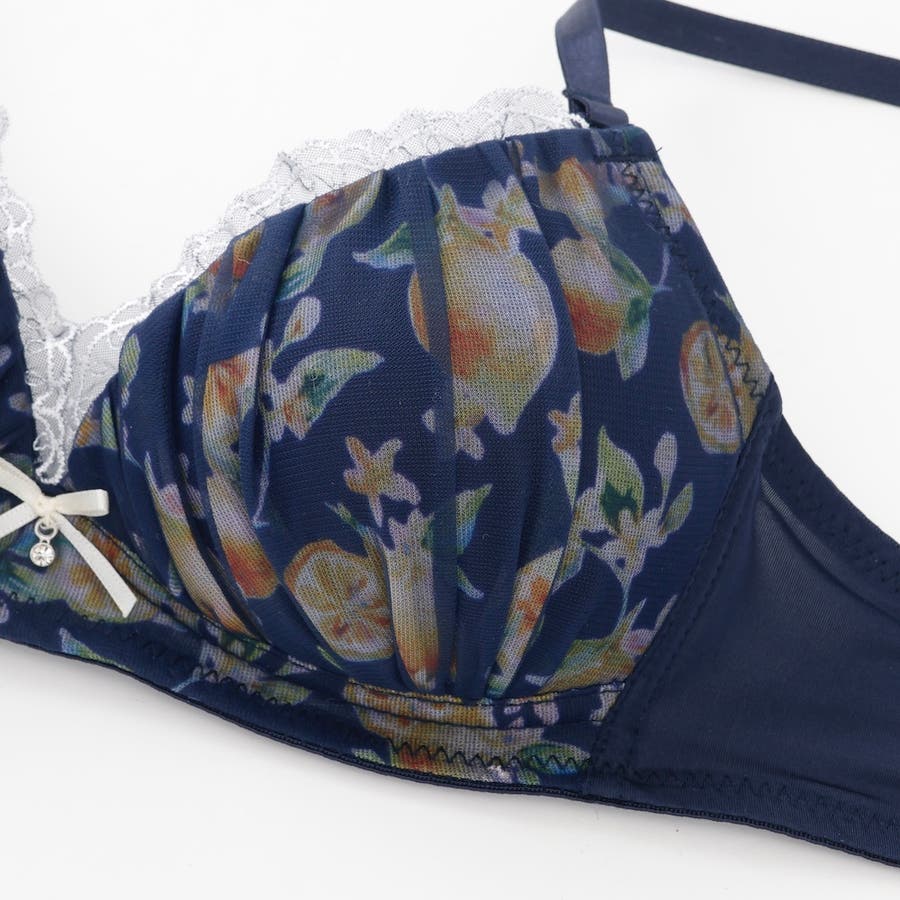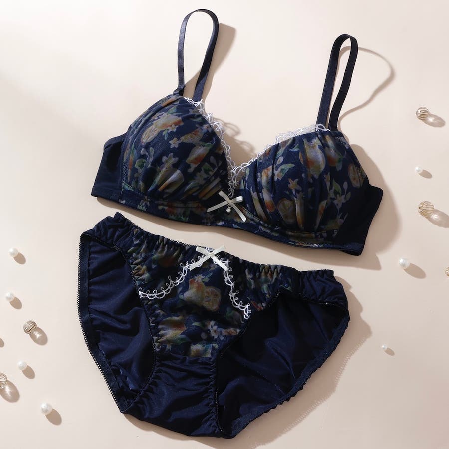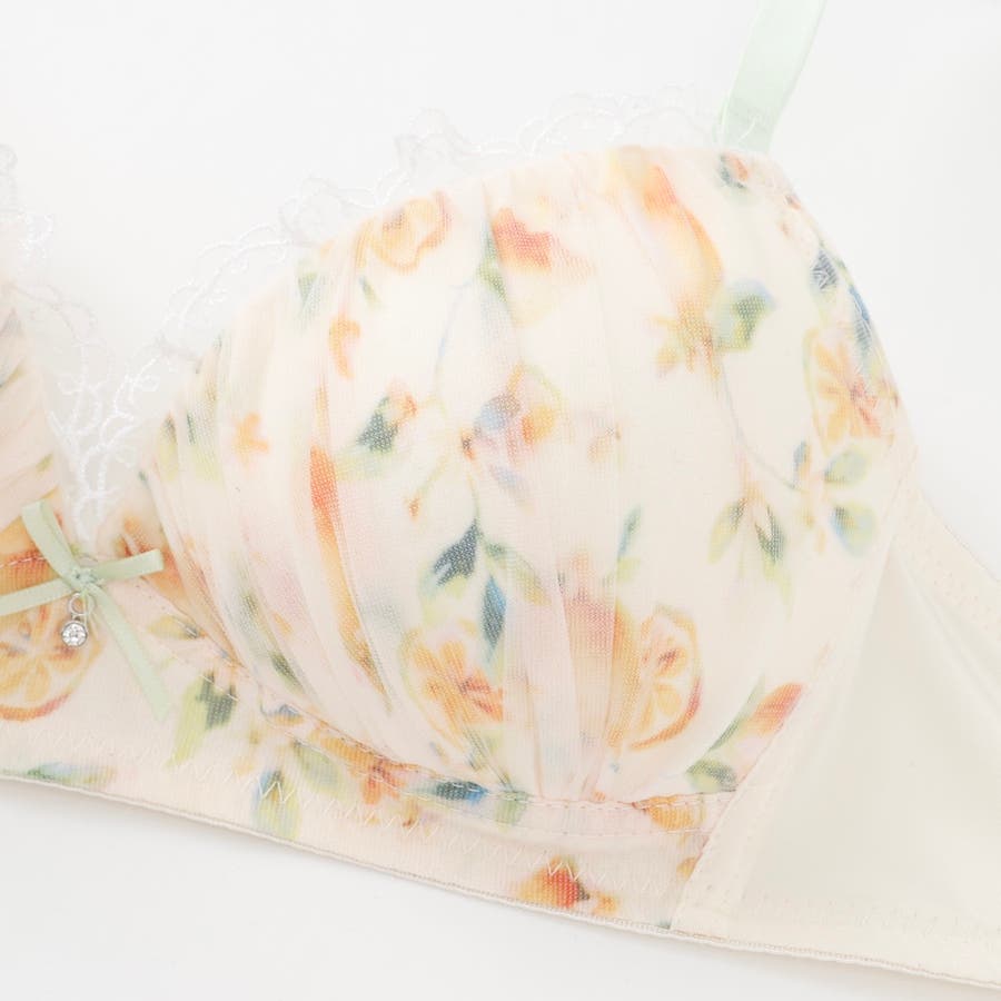 大好評”ノンワイヤーシリーズ”フレッシュなレモンプリントの上にチュールレースを重ね、ヘルシーな可愛さを一気に大人な表情へと変えてくれるノンワイヤーブラとショーツの下着セットです。