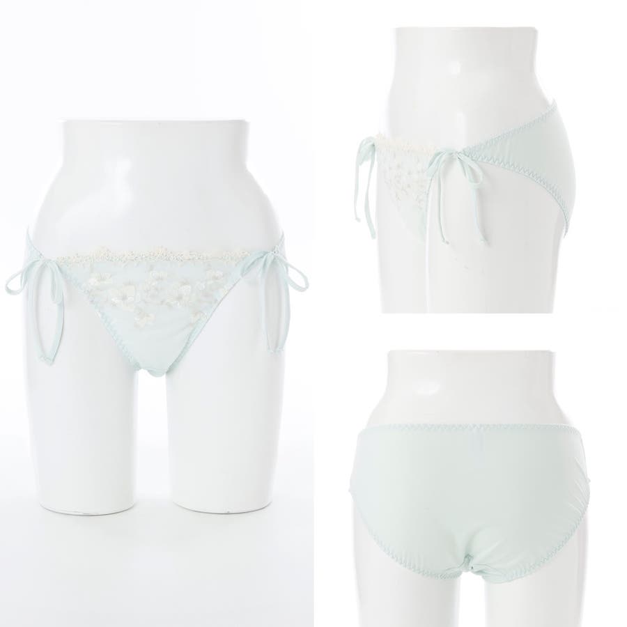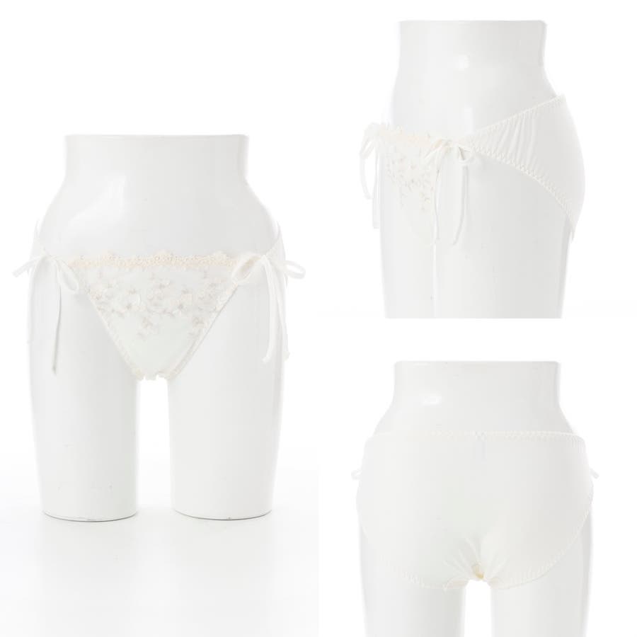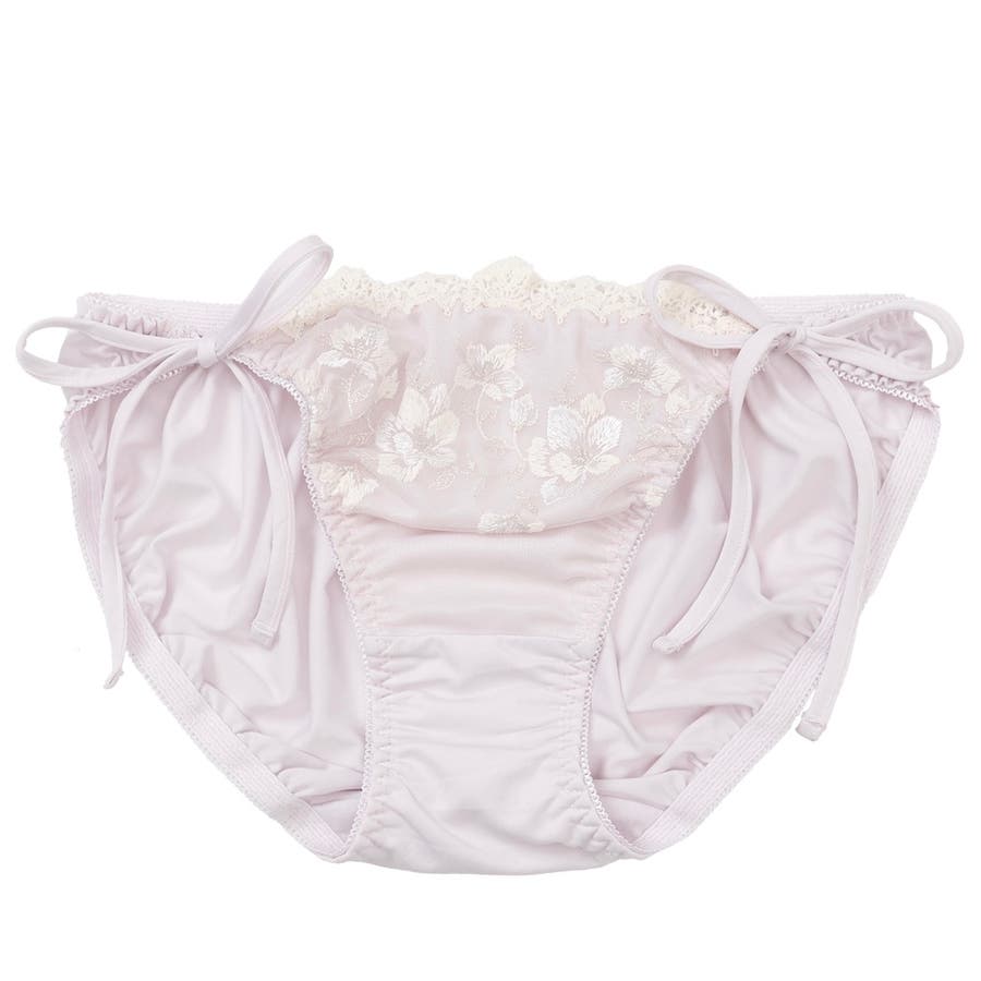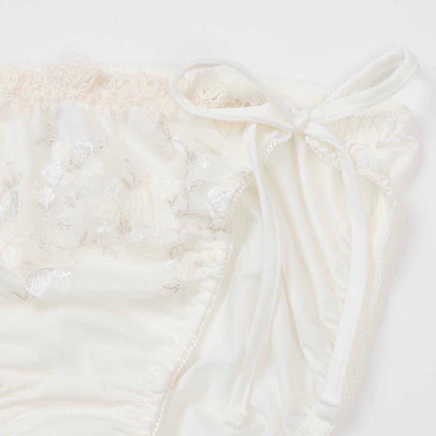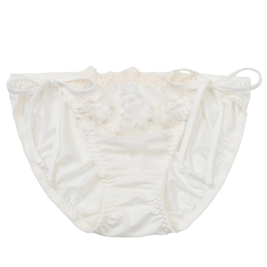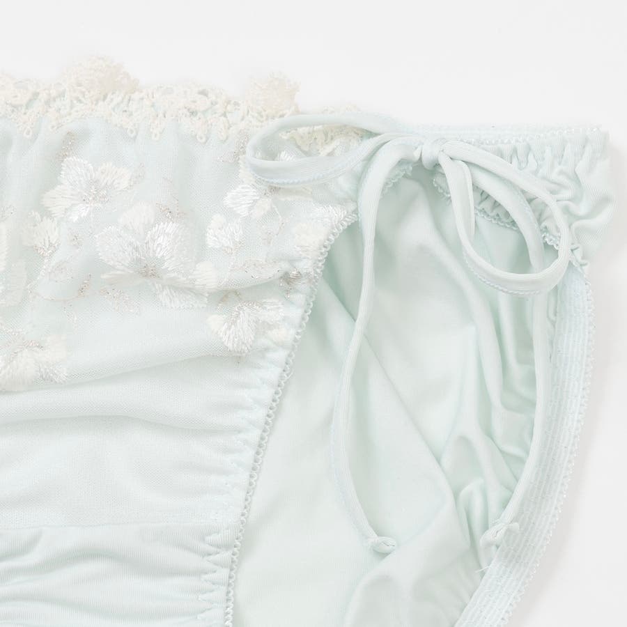 ウーリー糸とラメ糸を織り交ぜた優美なフラワー刺繍がなめらかな旋律のように彩られたひもショーツです。