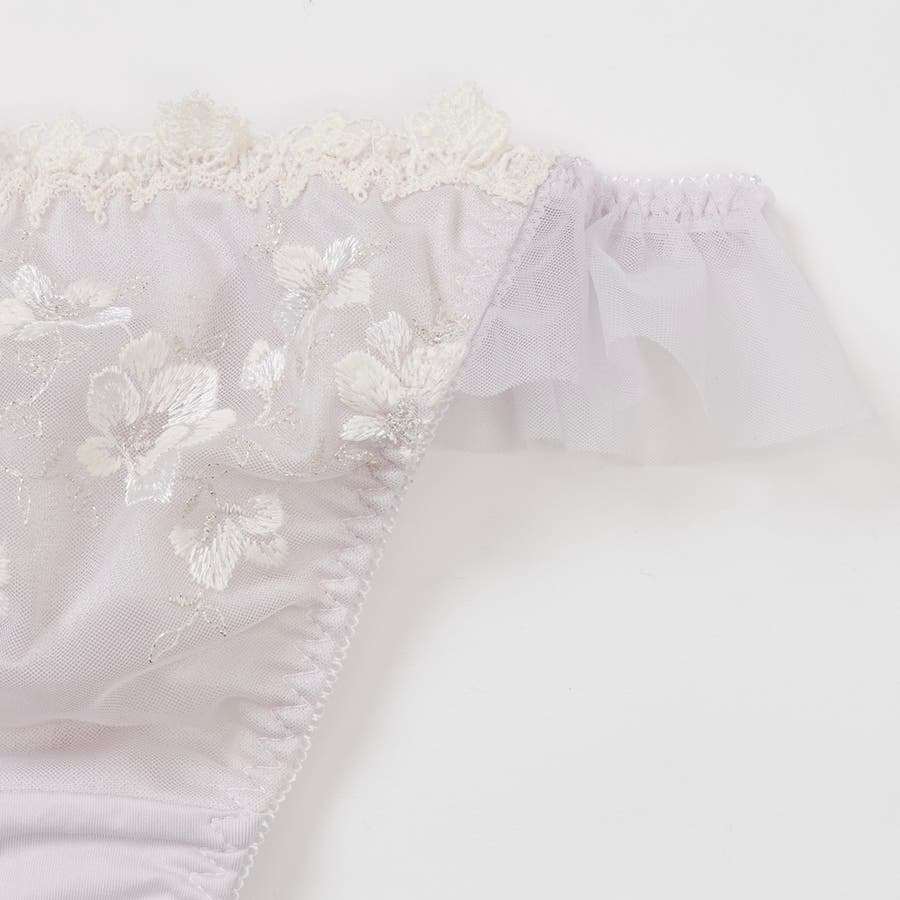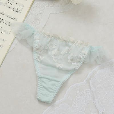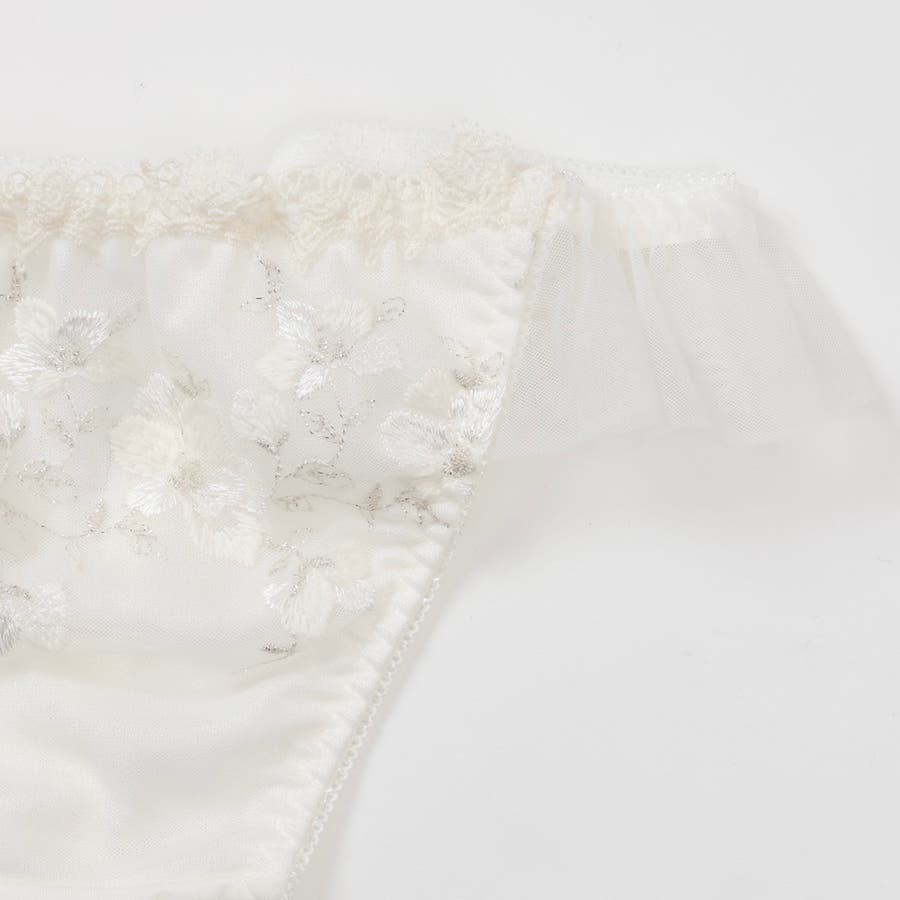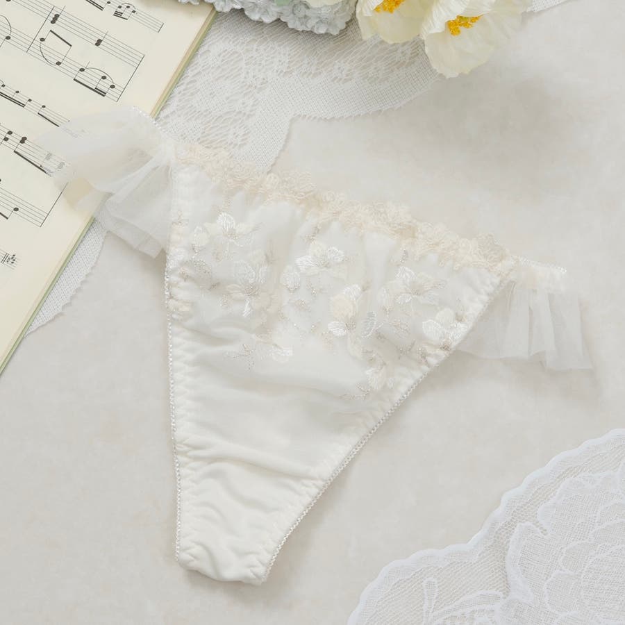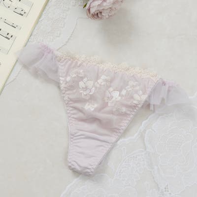 ウーリー糸とラメ糸を織り交ぜた優美なフラワー刺繍がなめらかな旋律のように彩られたTバックショーツです。