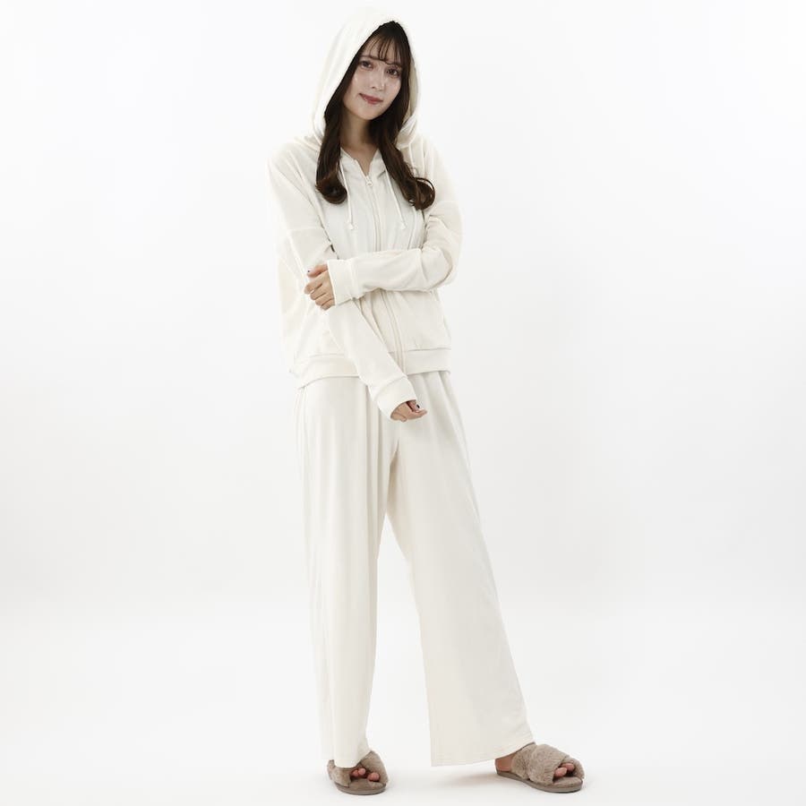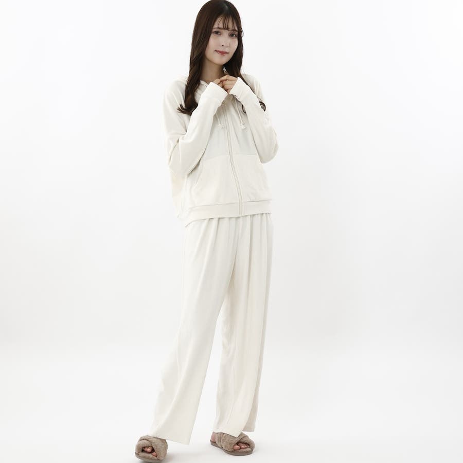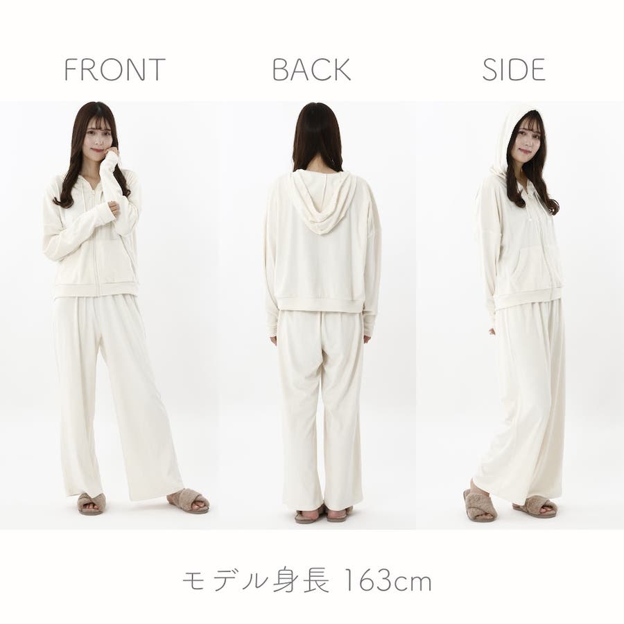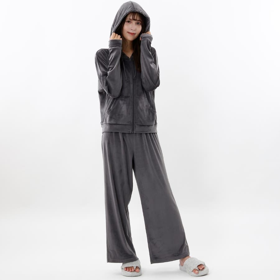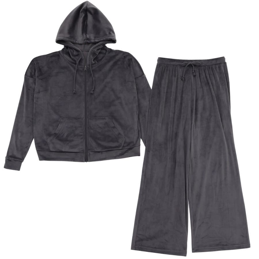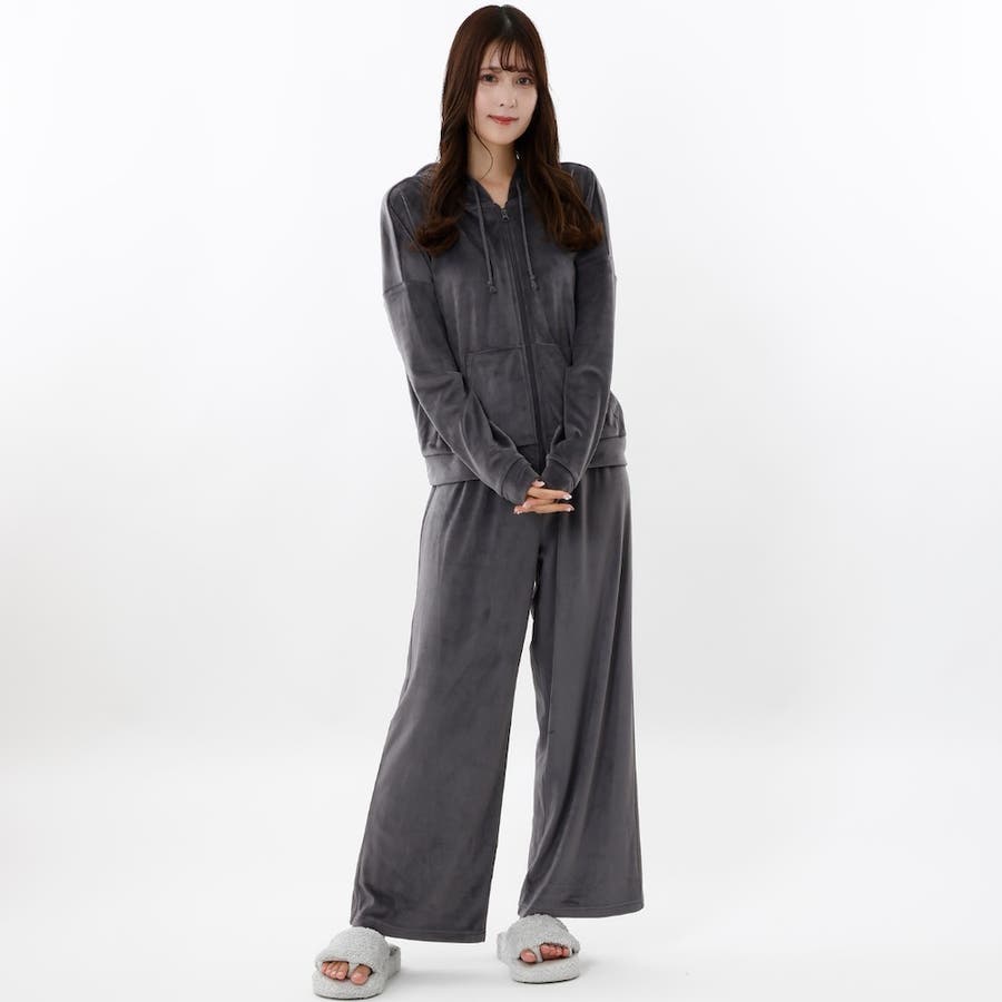 おうちでのリラックスタイムにぴったりなショート丈のジップパーカーとワイドパンツがセットの楽ちんなルームウェアです。