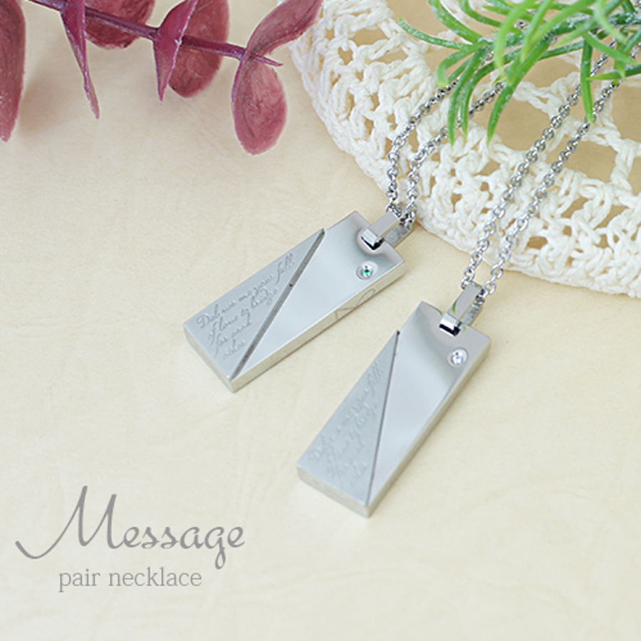 メッセージが刻印されたプレートのペアネックレス 一粒ラインストーン