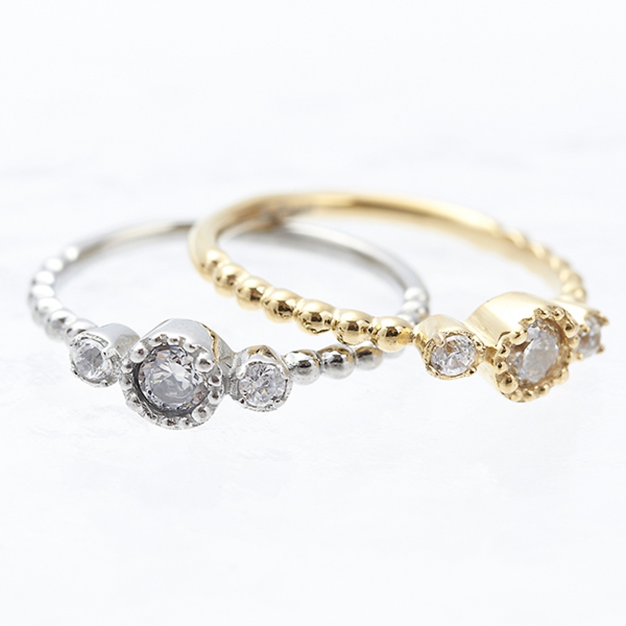 細見のミル打ちのリングに大小合わせて3石のジルコニアが輝くリング