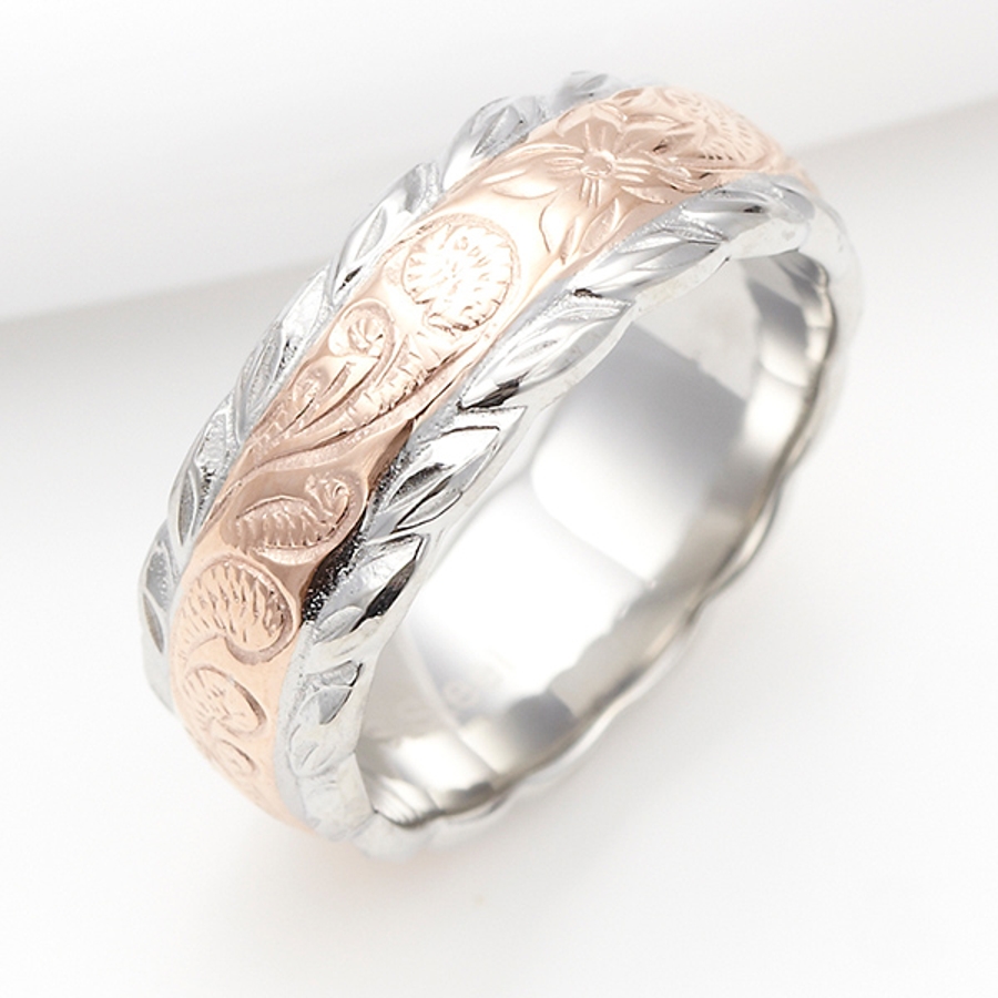 サイドにリーフ柄を施したステンレスリングです。