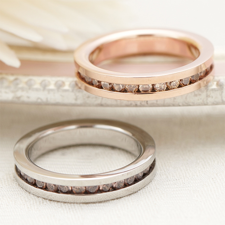 ラインストーンが並ぶフルエタニティリング お肌に優しい素材のサージカルステンレス…