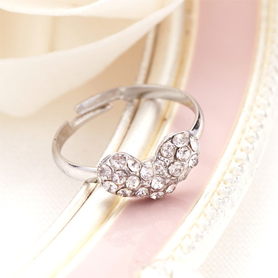 横長ハートがキュートなフリーサイズの指輪 ラインストーンがちりばめられたハートモ…