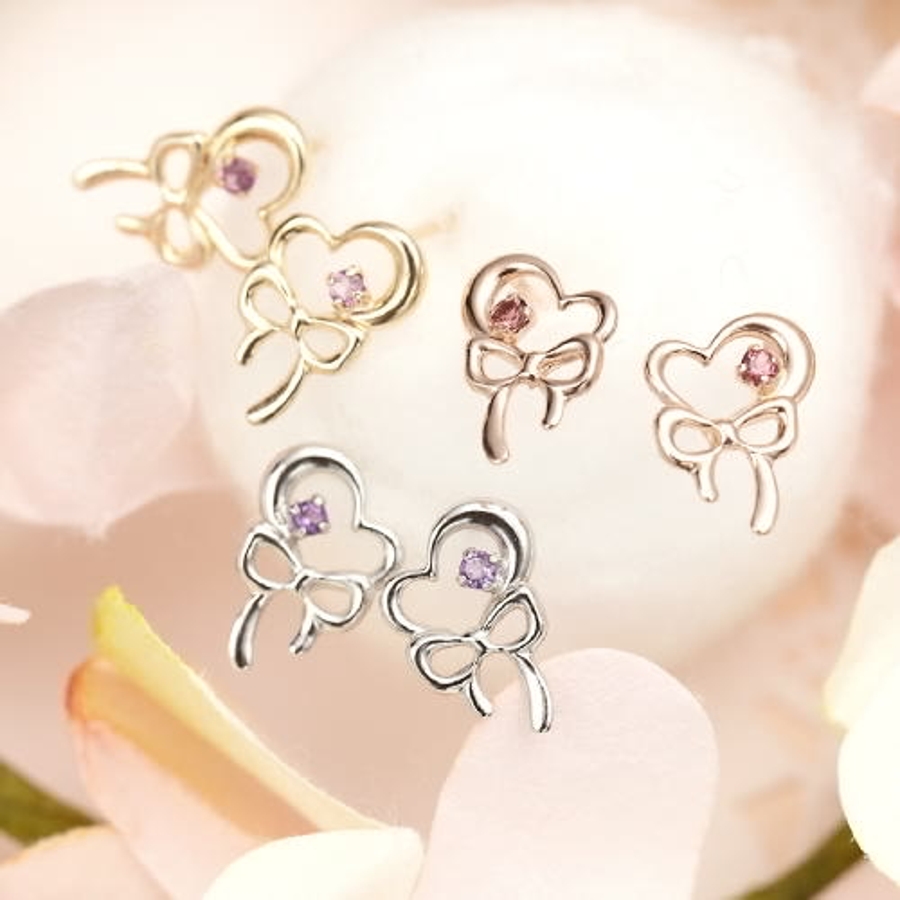 K10WG K10K10PG 1粒天然石付きオープンハートとリボンモチーフのピア…