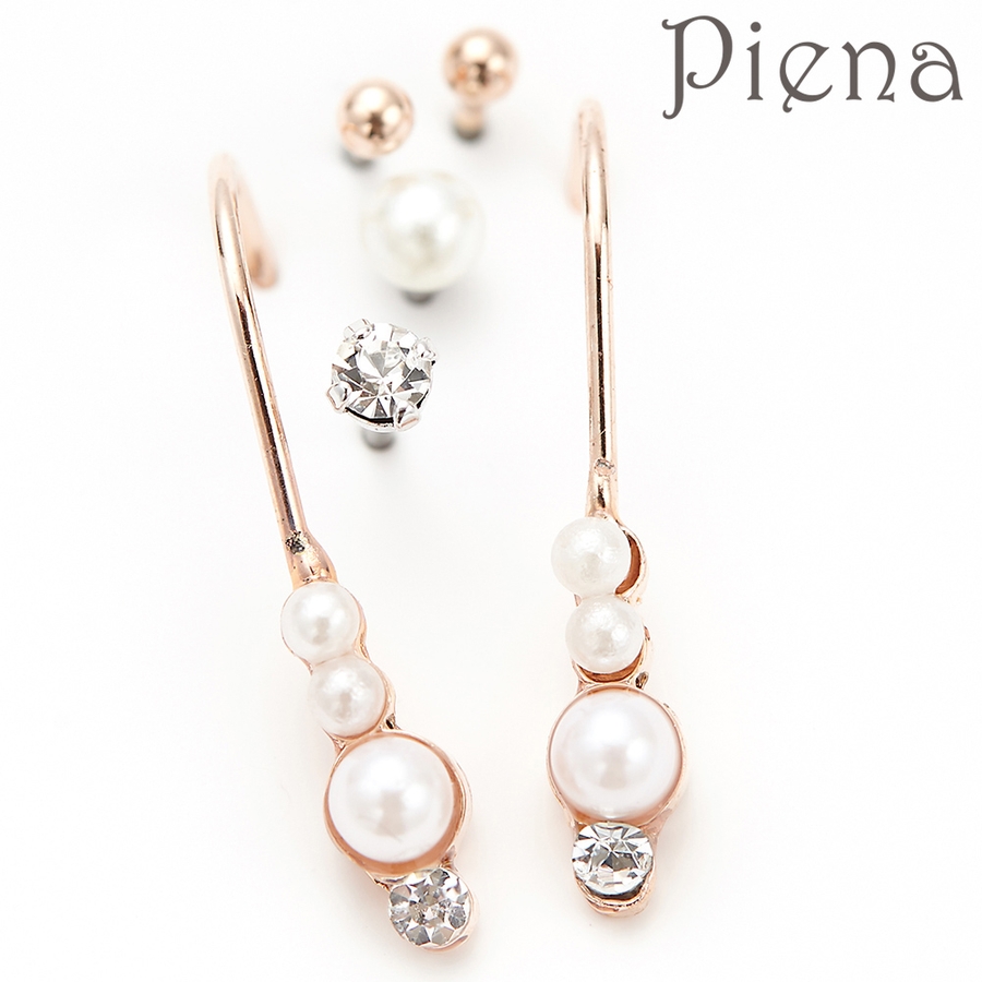パールとストーンでライン状に並べたフックピアスと1石ストーン、パール、メタルボールの6個セットピアスです。