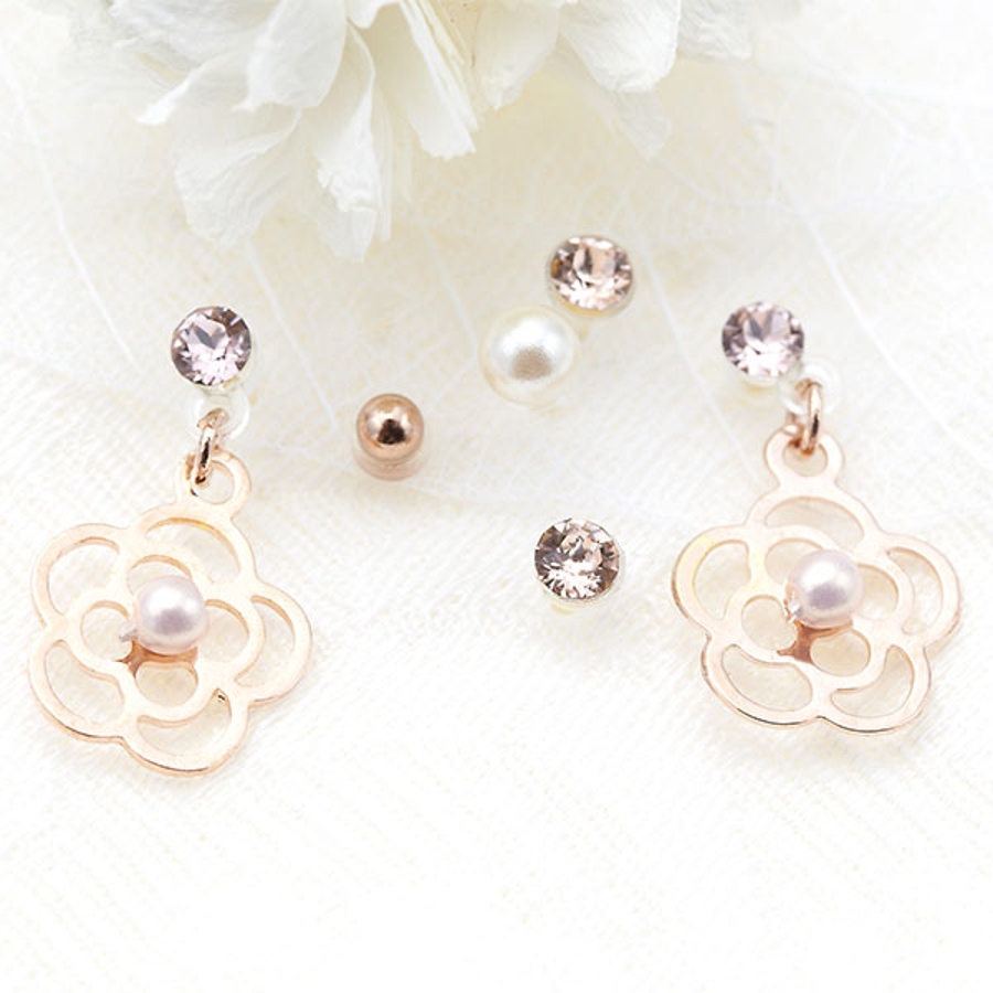 きらめくビジューと小粒パールをセットにした大人びた雰囲気になるセットピアス。