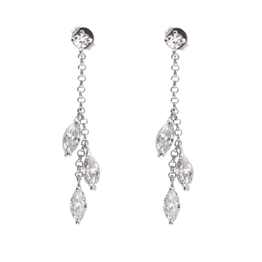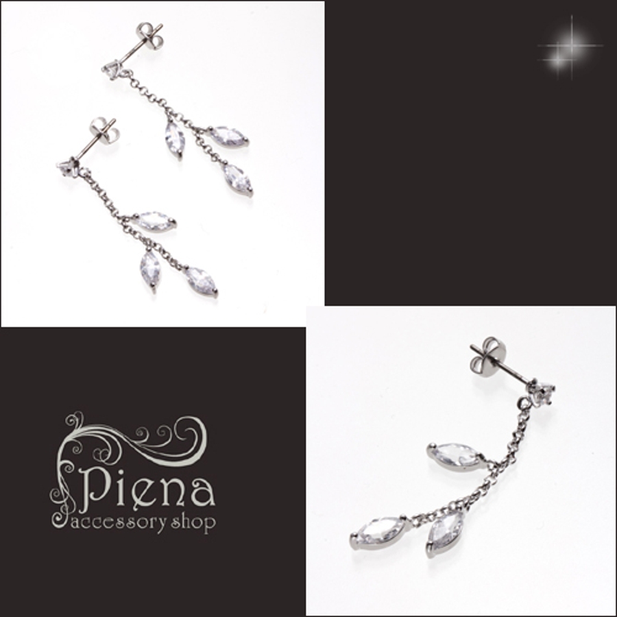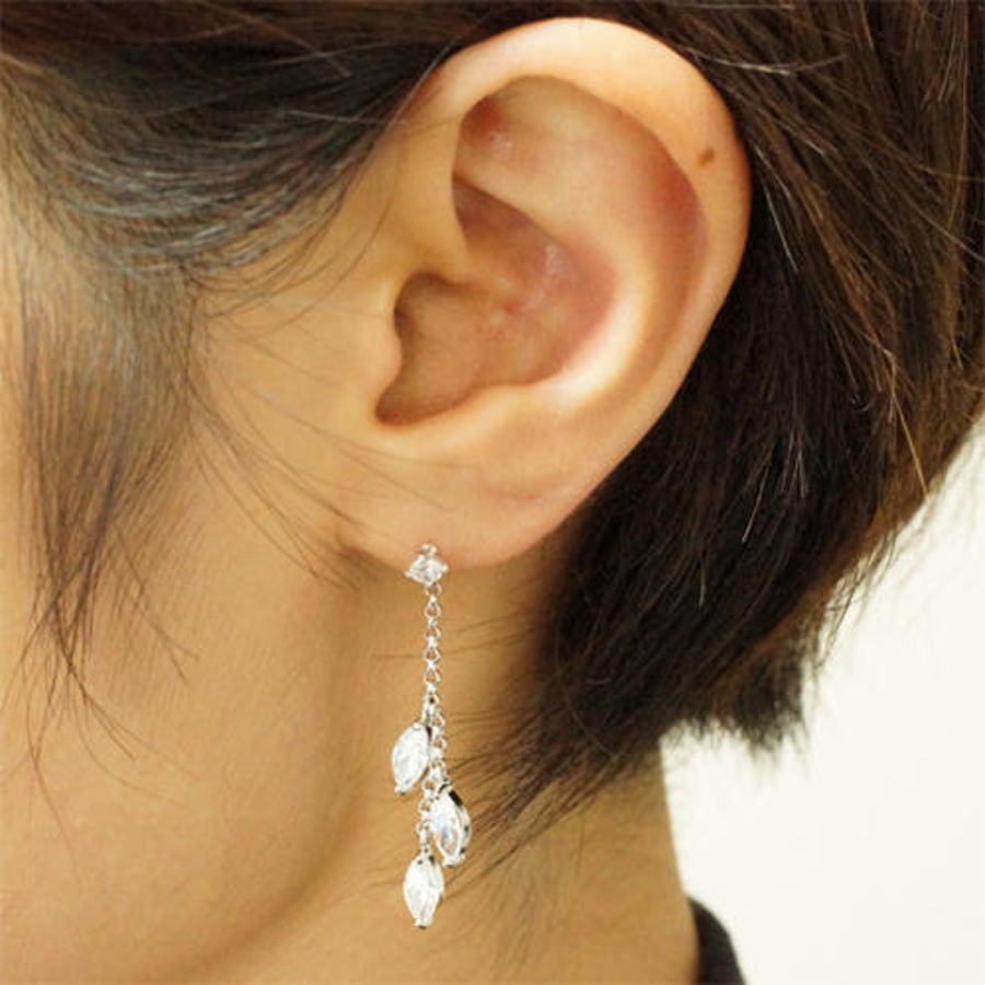 リーフモチーフピアス キュービックジルコニア3粒が耳元でキラキラ揺れるぶら下がり…