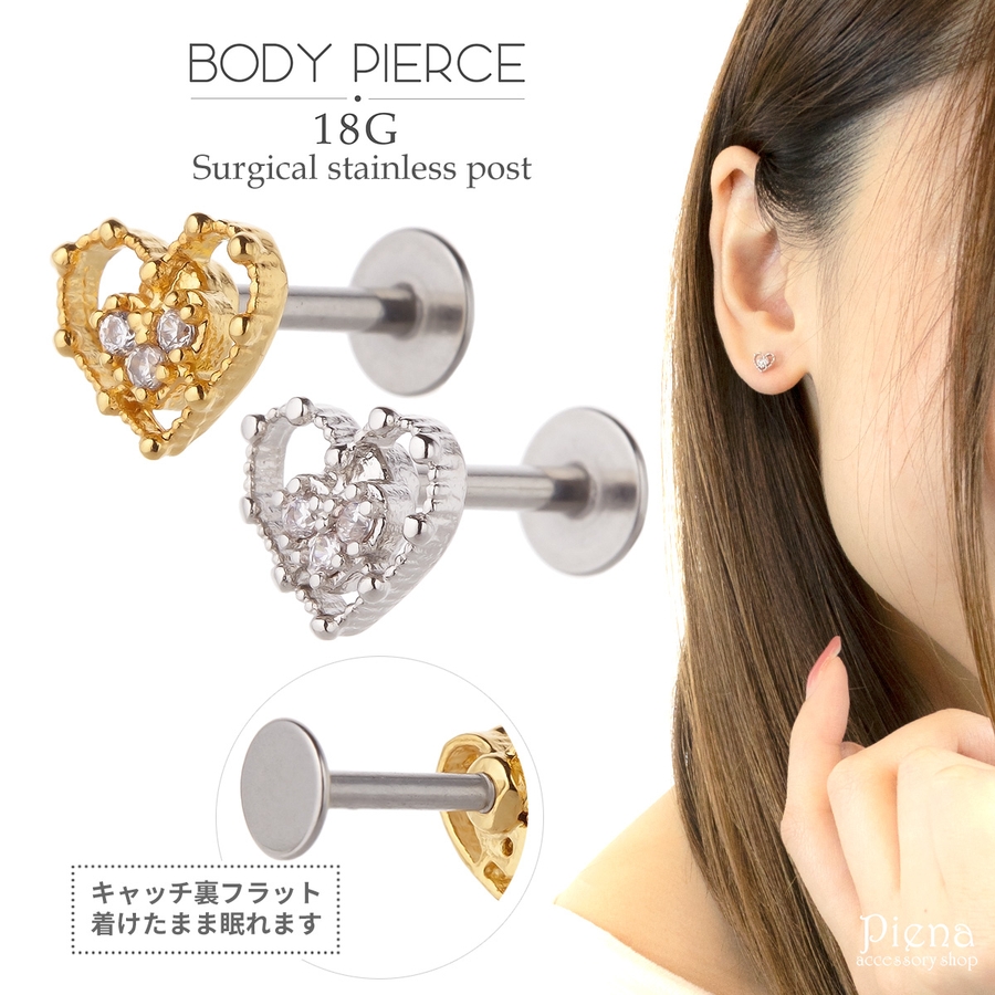 ハート型モチーフにキュービックジルコニアをセットしたボディピアスです。