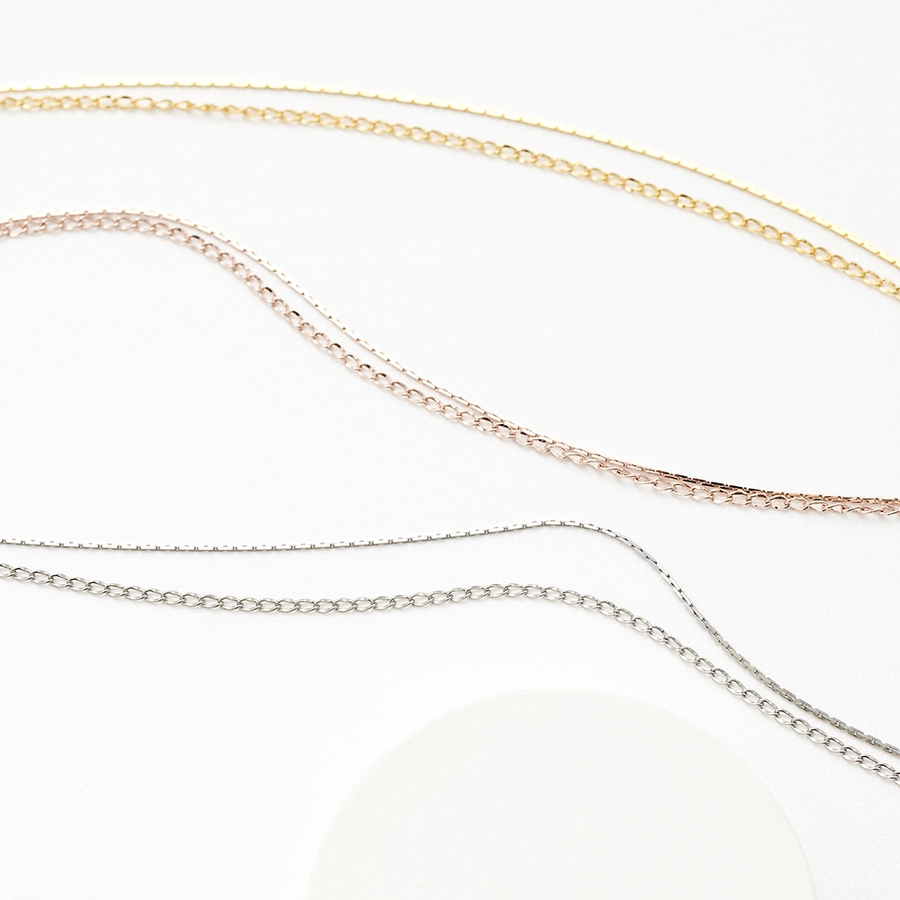 華奢なチェーンはあずきチェーンとなめらかなスネイクチェーンの2本。