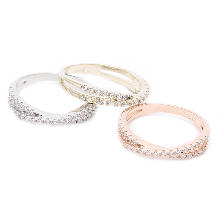 滑らかにクロスしたリングにキュービックジルコニアを贅沢に並べてセット。
