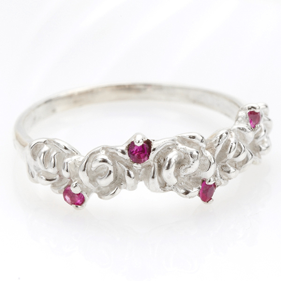 半周に掘りこまれたバラの花とローズカラーのストーンがキラキラと輝き