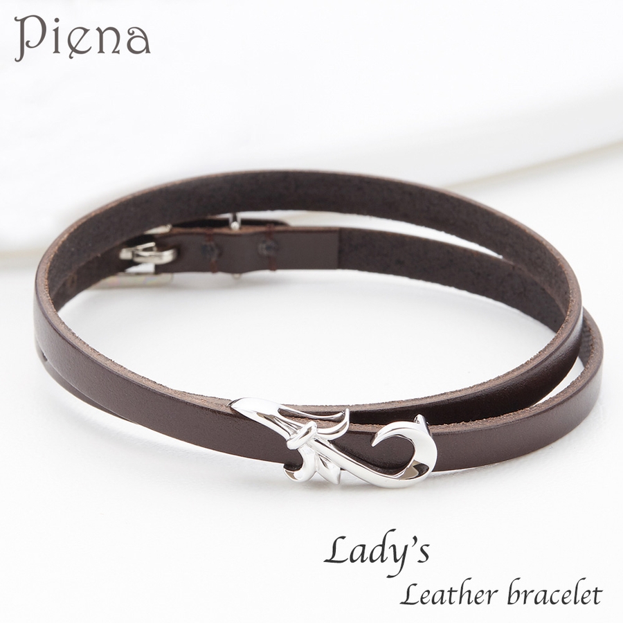 アラベスク細身レザーブレスレット シルバー925製 こげ茶色