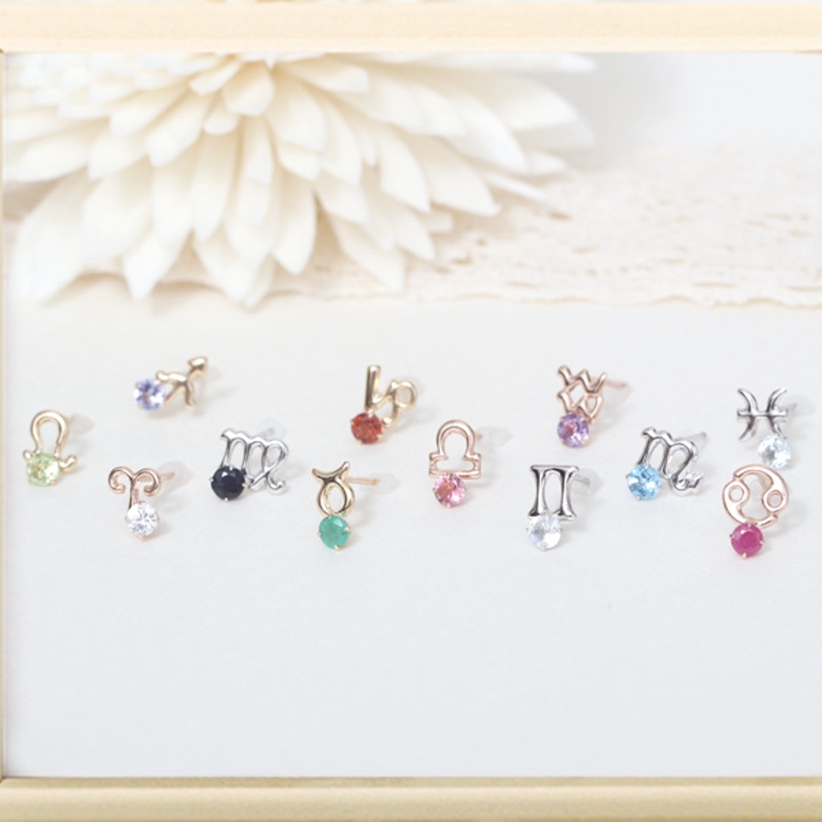 十二星座のシンボルマークと天然石の誕生石を組み合わせたスタッドピアスです。モチーフ全体で直径5mm程度の大きさなので、主張しすぎない、大人っぽさが魅力。オフィスシーンからお出かけや普段使いなど、たくさんのコーディネートで使えそうです。