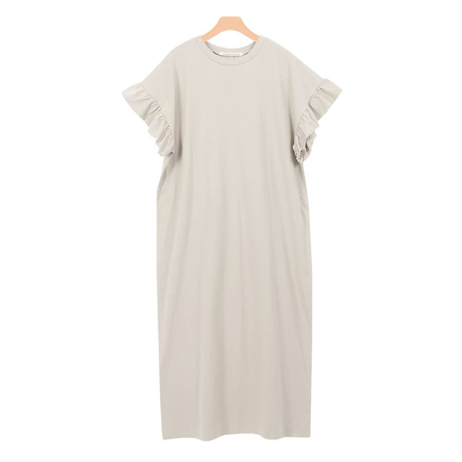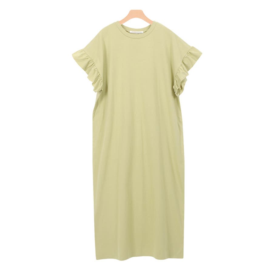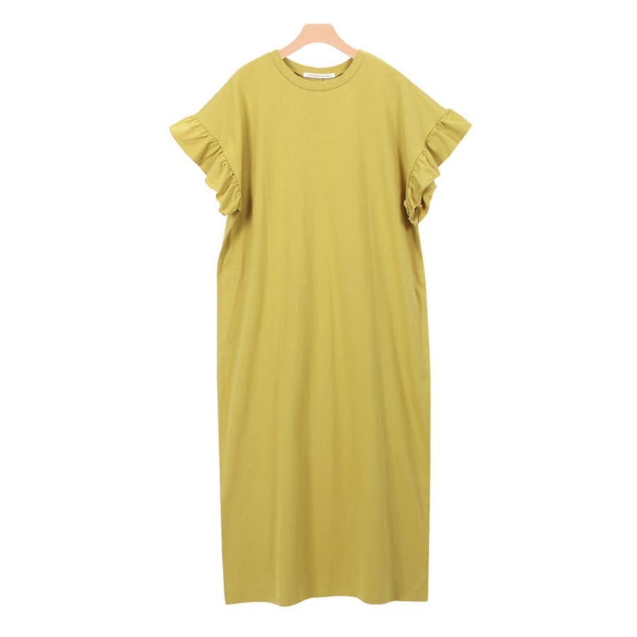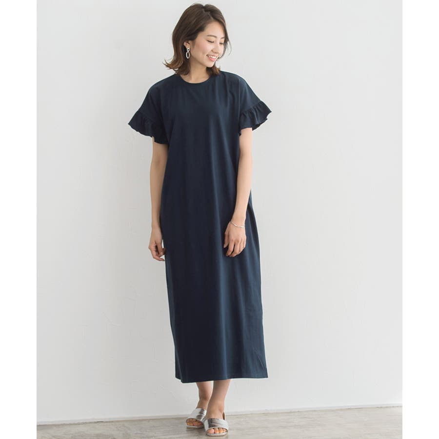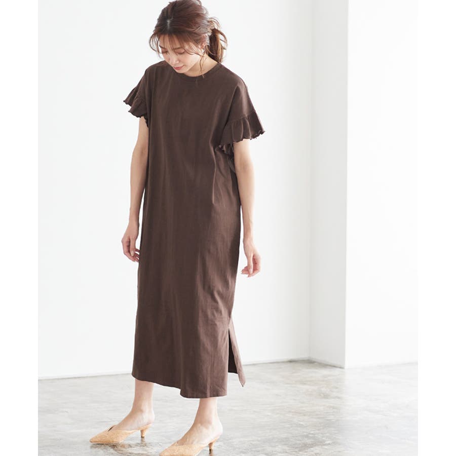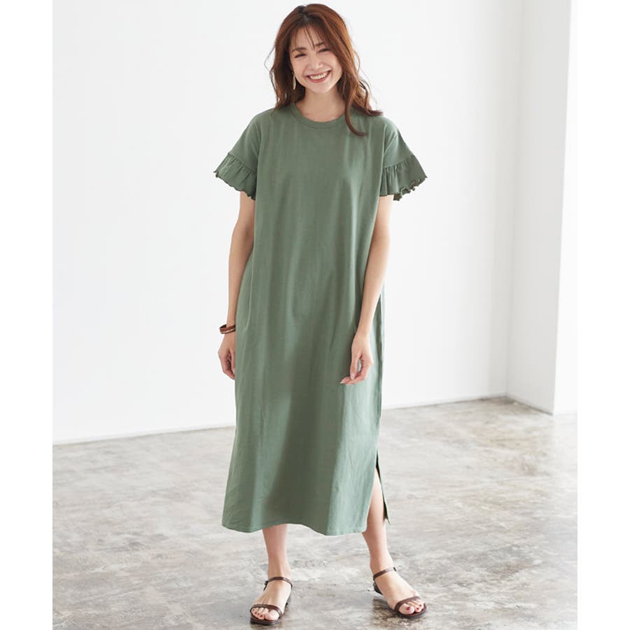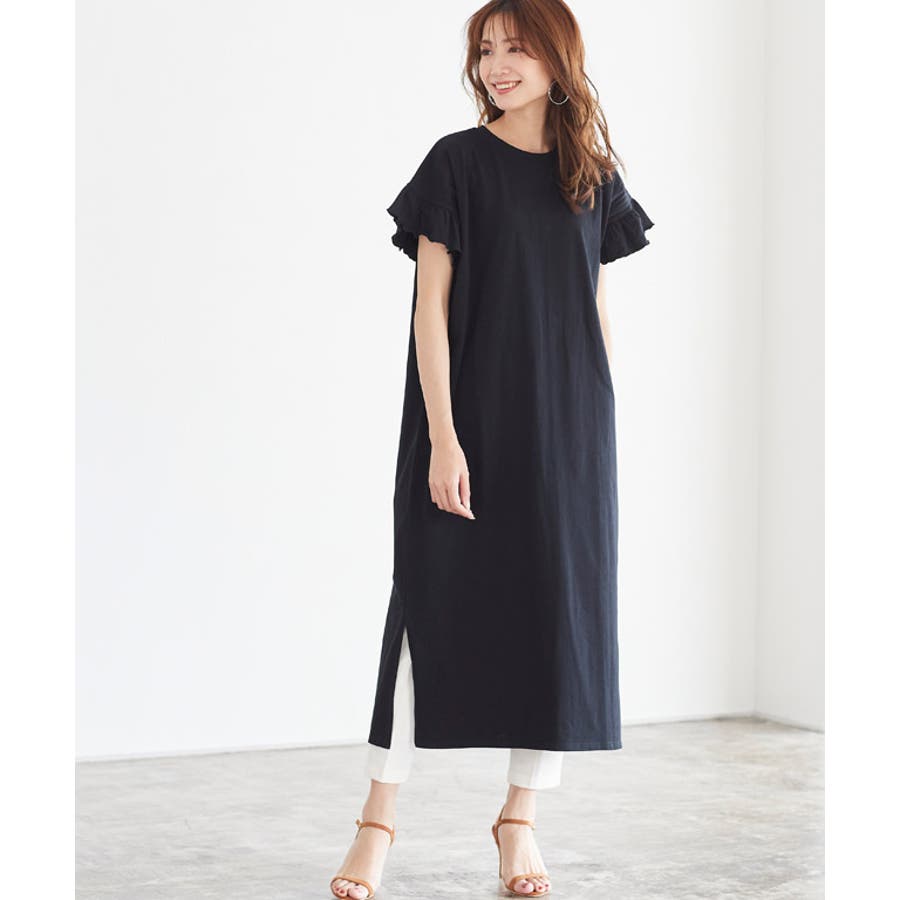 フリルロングワンピース フリル 袖コン スリット ロング 膝下 半袖