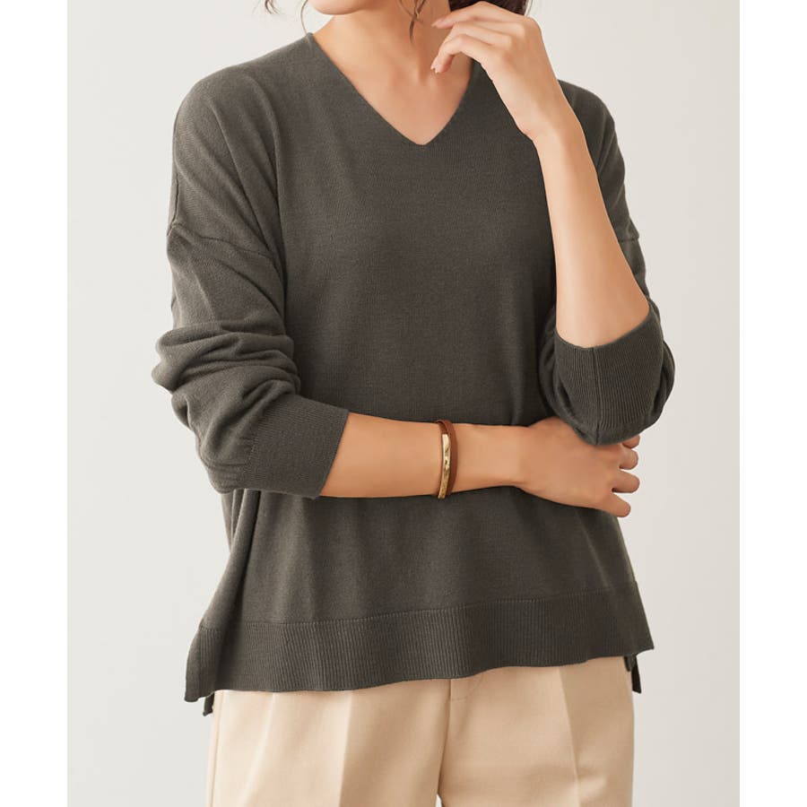 ウール混でふんわりとしたやわらかな肌触りが魅力の一つ。ハイゲージで繊細な編地が大人上品な印象へと導き、薄手で軽いのに暖かみのある着心地を叶えます。