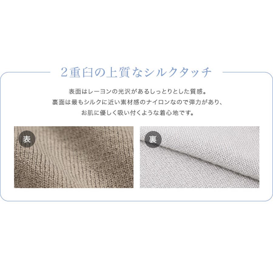 レーヨン混素材なので、肌馴染みは抜群。光沢感があり柔らかでまるでシルクのようなリッチな風合いは一度着るとやみつきに。軽い力で伸びるので、着心地と肌馴染みの良さが魅力の一枚です。
