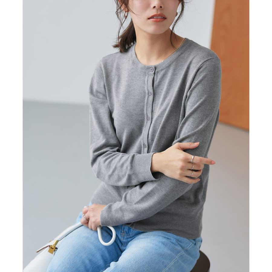 優しい印象のクルーネック。前を閉じてトップスとしての着用が旬なスタイルに仕上げてくれます。