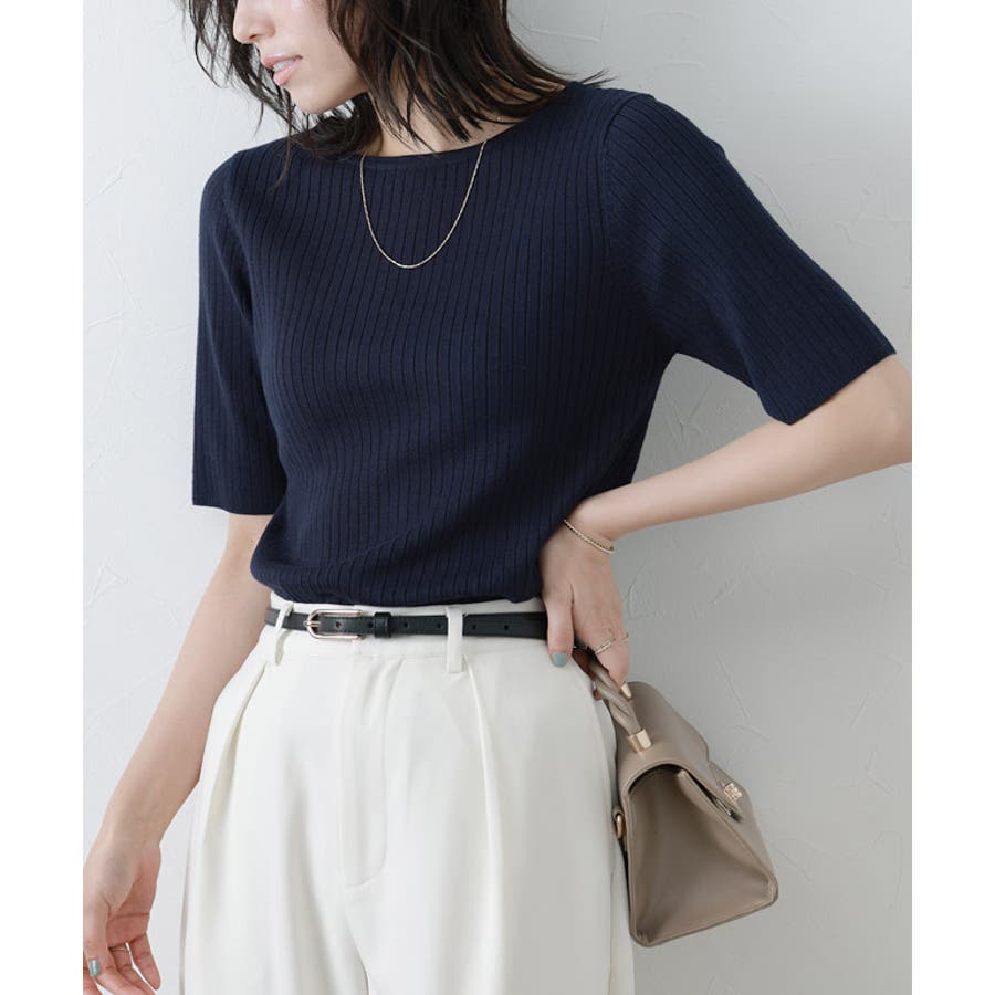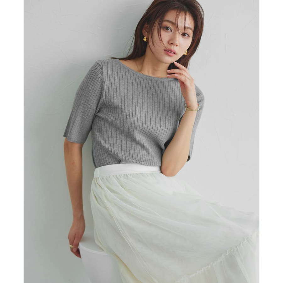 【ボートネック】緩やかな曲線が鎖骨部分を綺麗に見せます。ネックラインは切り替えで細リブにすることで、きちんと感のある大人の装いに。リブ編みで表情を加え、フィットしすぎない程良いゆるさが魅力です。ON/OFF問わず、気分やシーンに合わせた着こなしが楽しめます。