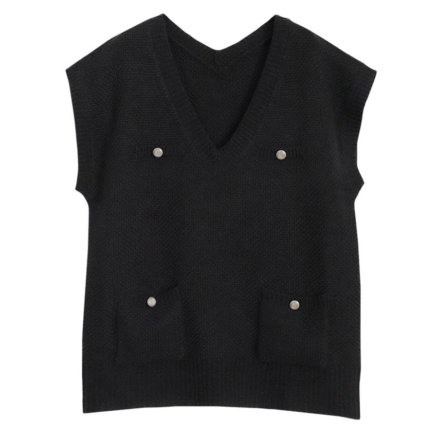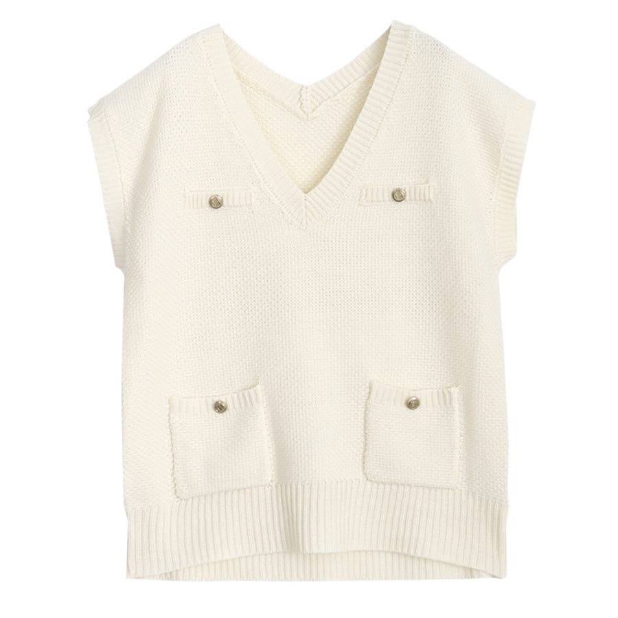 金ボタンがスタイリングの程良いアクセントになり、前後のVネックが大人の抜け感をプラスしてくれます。