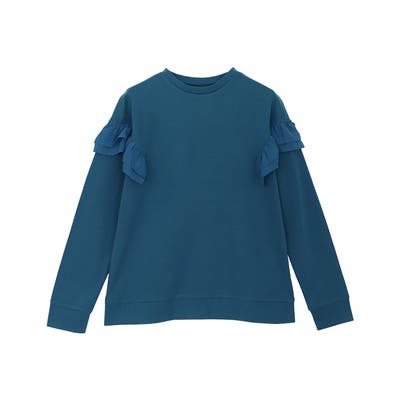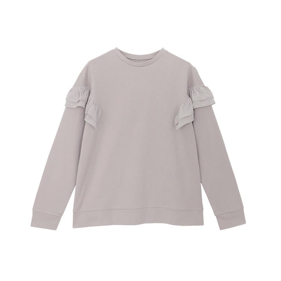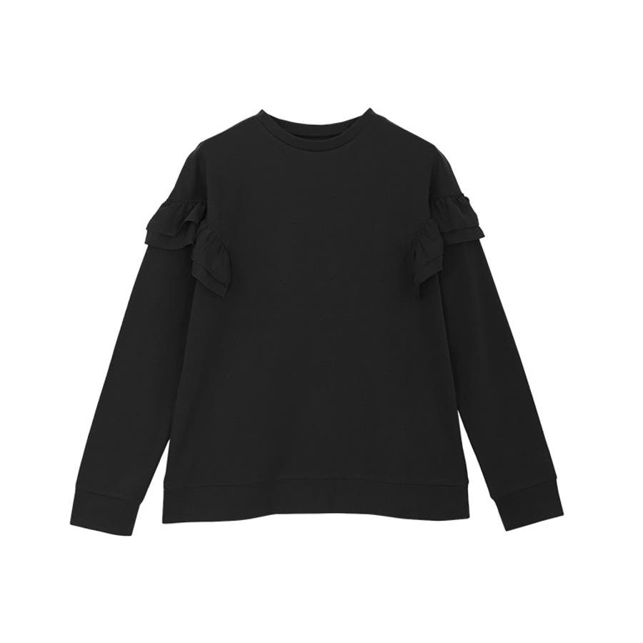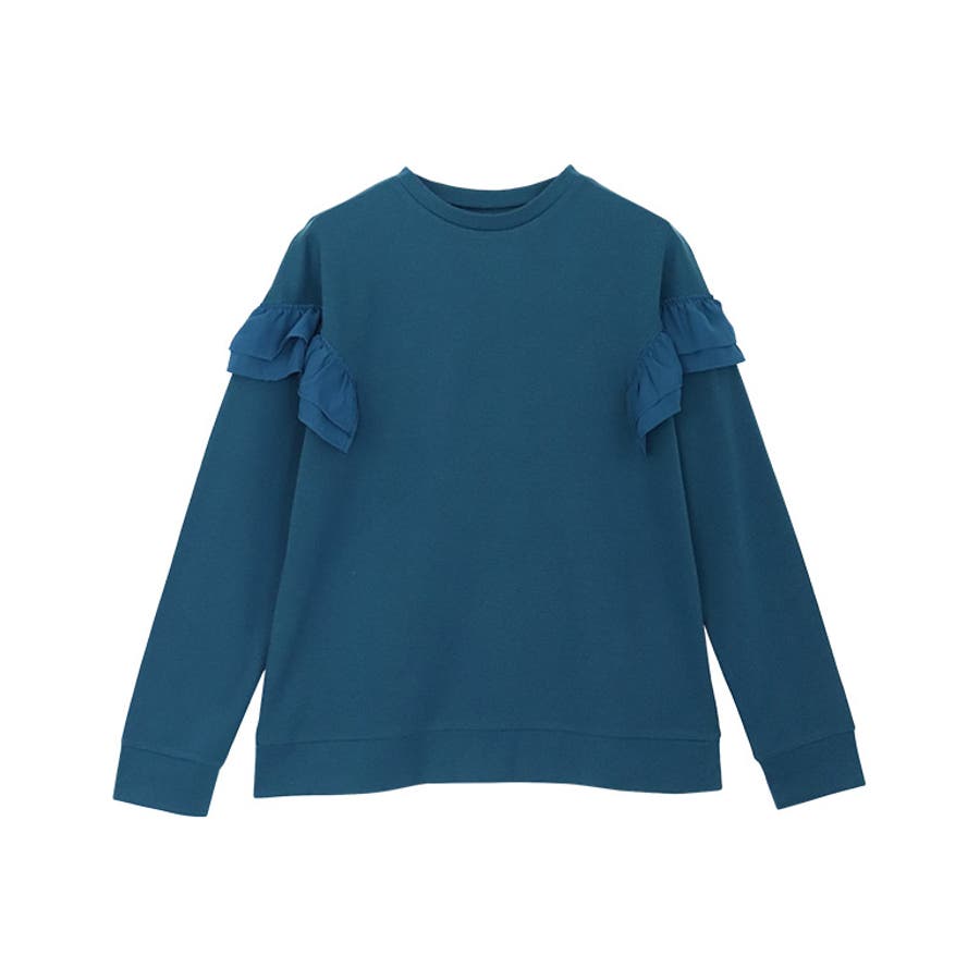 程良くハリのある柔らかなポンチ素材は着心地抜群。滑らかな表面感がきれいめな印象に導きます。フリル部分はシフォン素材で、きれいな女性らしいシルエットを演出します。