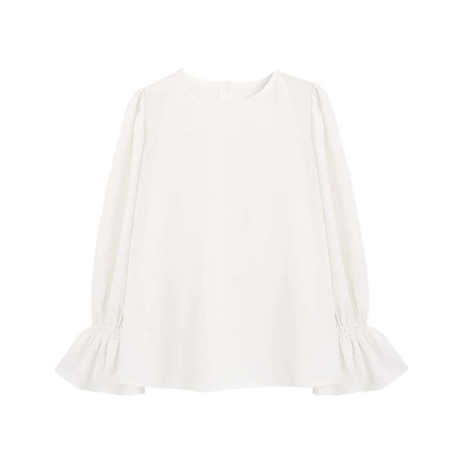 キャンディスリーブが女性らしいTブラウス。袖口はゴム仕様なので、腕まくりしても自然とラフなボリュームに。フロントはシンプルなデザインですが、後ろのパールボタンがワンポイントになり、女性らしさ漂うバックスタイルに仕上げてくれます。
