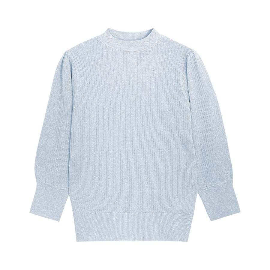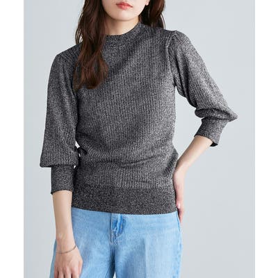 旬なラメで品良く仕上げたデザインニット。二の腕をカバーしてくれるボリューム袖と、すっきり見え叶う細リブデザインが嬉しいポイント◎浅めのハイネックで上品に仕上げ、大人に似合う一枚に。