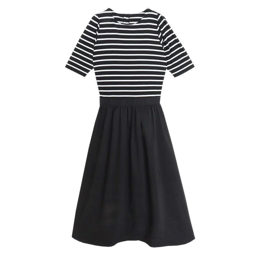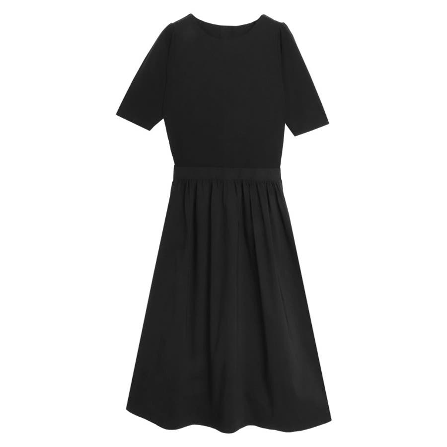 異素材がドッキングされたデザインで、トップスをインしているかのように見える主役級ワンピース。後ろにはパールボタンを施し、上品かつバックスタイルも抜かりなく仕上がります。肩部分とスカートにはギャザーを入れて、女性らしい印象に。5分袖で腕周りをカバーしてくれるのも嬉しいポイントです◎