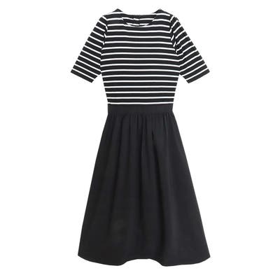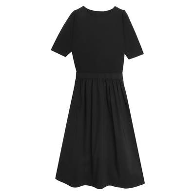 トップス部分は、程良く厚みがあり伸縮性に優れた綿混素材。肌馴染みが良くストレスフリーな着心地が叶います。スカート部分は、さらっとした程よくハリ感のある素材を使用した異素材使いです。
