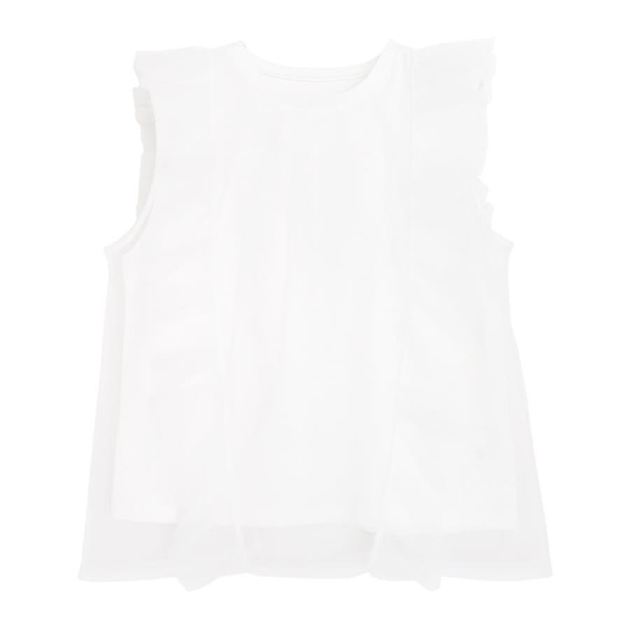 チュール使いが今年らしいデザインのカットソー。前面に施したフリルがフェミニンなアクセントに。アウトスタイルで透け感を見せたり、インスタイルですっきりと着こなしても◎ボトムスはカジュアルに外すのが今年らしくておすすめです。