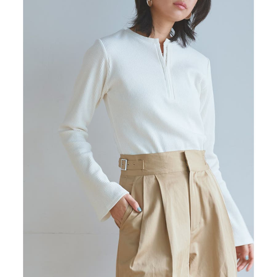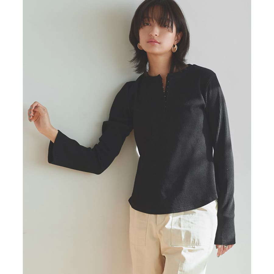 トレンドスタイルに導くヘンリーネックのリブトップス。フロントのホックデザインが、シンプルながらもアクセントをプラスしてくれるデザインです。ホックを開けてキーネック風にすることでヘルシーで抜け感のあるスタイルに。ゆったりとしたフレアベルスリーブで女性らしさを加え、裾はラウンドカットにしてアウトスタイルでもバランスよく仕上がる一枚です。