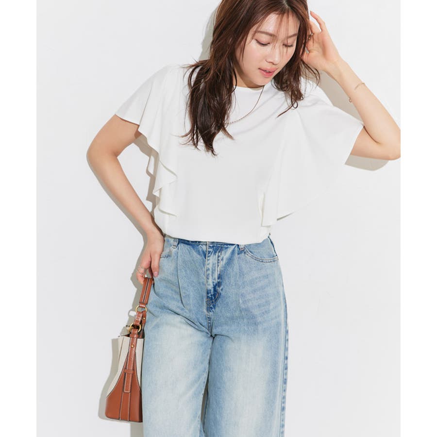 肩から施したラッフルデザインが華やかな雰囲気に仕上げてくれ、気になる腕回りをさりげなくカバー◎アウトでもインスタイルでもどちらも楽しんでいただけます。ベースなシンプルなので、ボトムスを選ばずON/OFF着回せます。