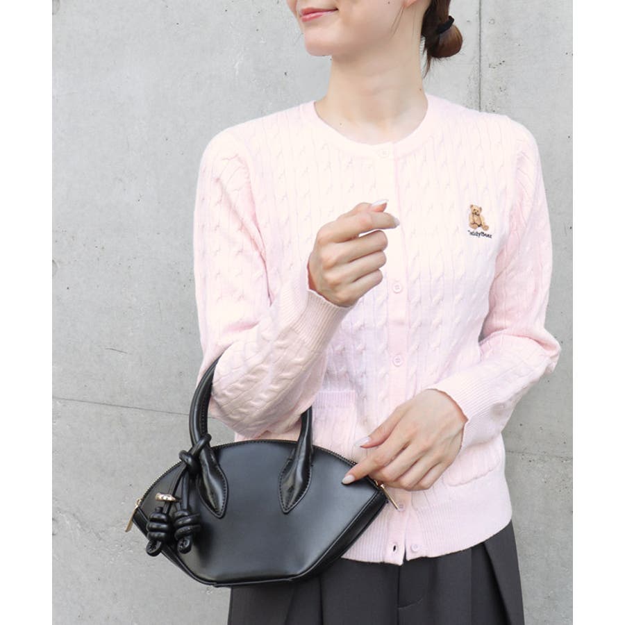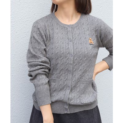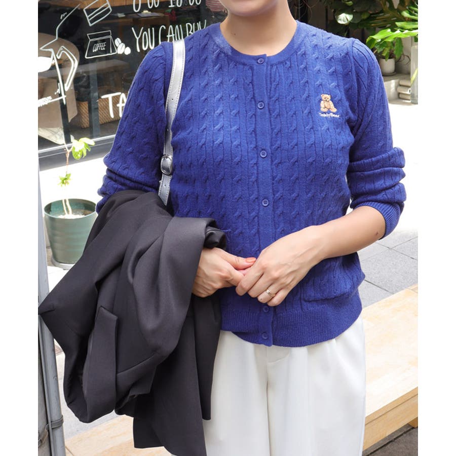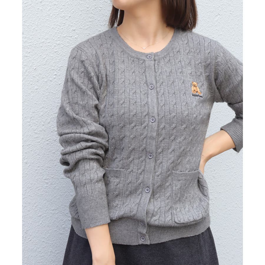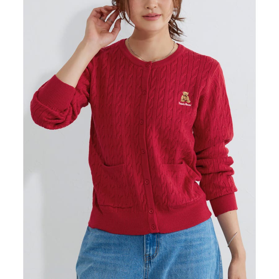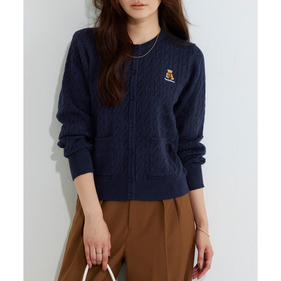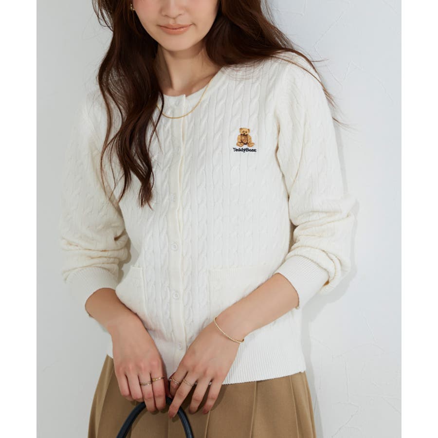 立体感のあるケーブルデザインを全面に施したカーディガンは、細めのラインで主張しすぎず上品な印象に。胸元のTeddyBear刺繍がさりげないアクセントとなり、トレンド感もプラスしてくれます。ベーシックなシルエットなのでアウターとも合わせやすく、ボトムスを選ばず幅広く着回せる万能な一枚です。