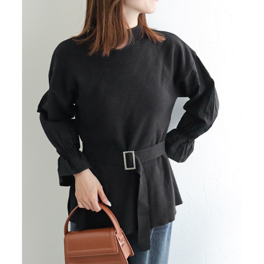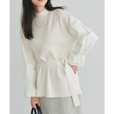 布帛をドッキングしたキャンディースリーブがポイント。袖口のギャザーがふんわりとしたボリュームを生み、女性らしい印象に。裾のサイドスリットで軽やかさをプラスし、共布ベルトでウエストマークすればシルエット変化も楽しめる一枚です◎