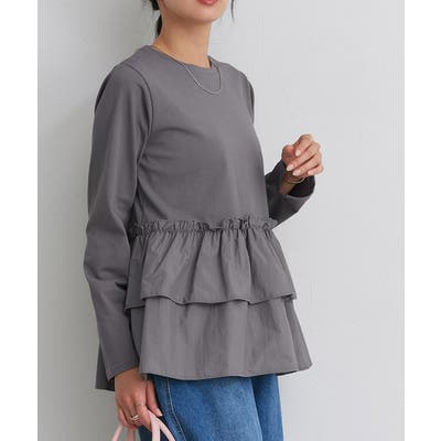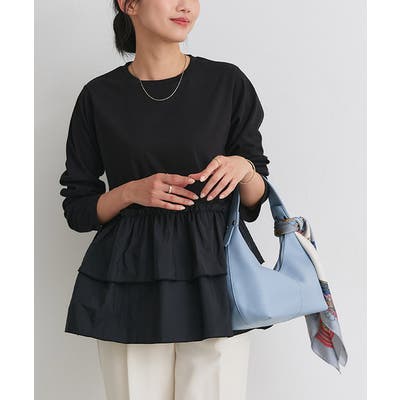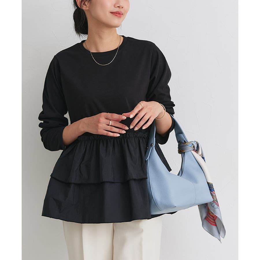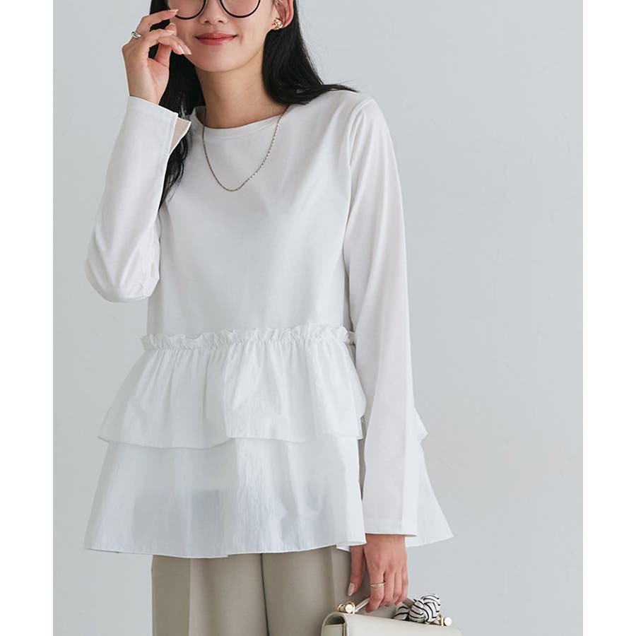 カットソーの気軽さとブラウスの華やかさを兼ね備えたドッキングデザイン。Aラインシルエットが体のラインを拾わず、ふんわりと自然に体型カバーを叶えます。フリルディテールが女性らしい印象に導いてくれて一枚でスタイリングが決まる主役トップスです。